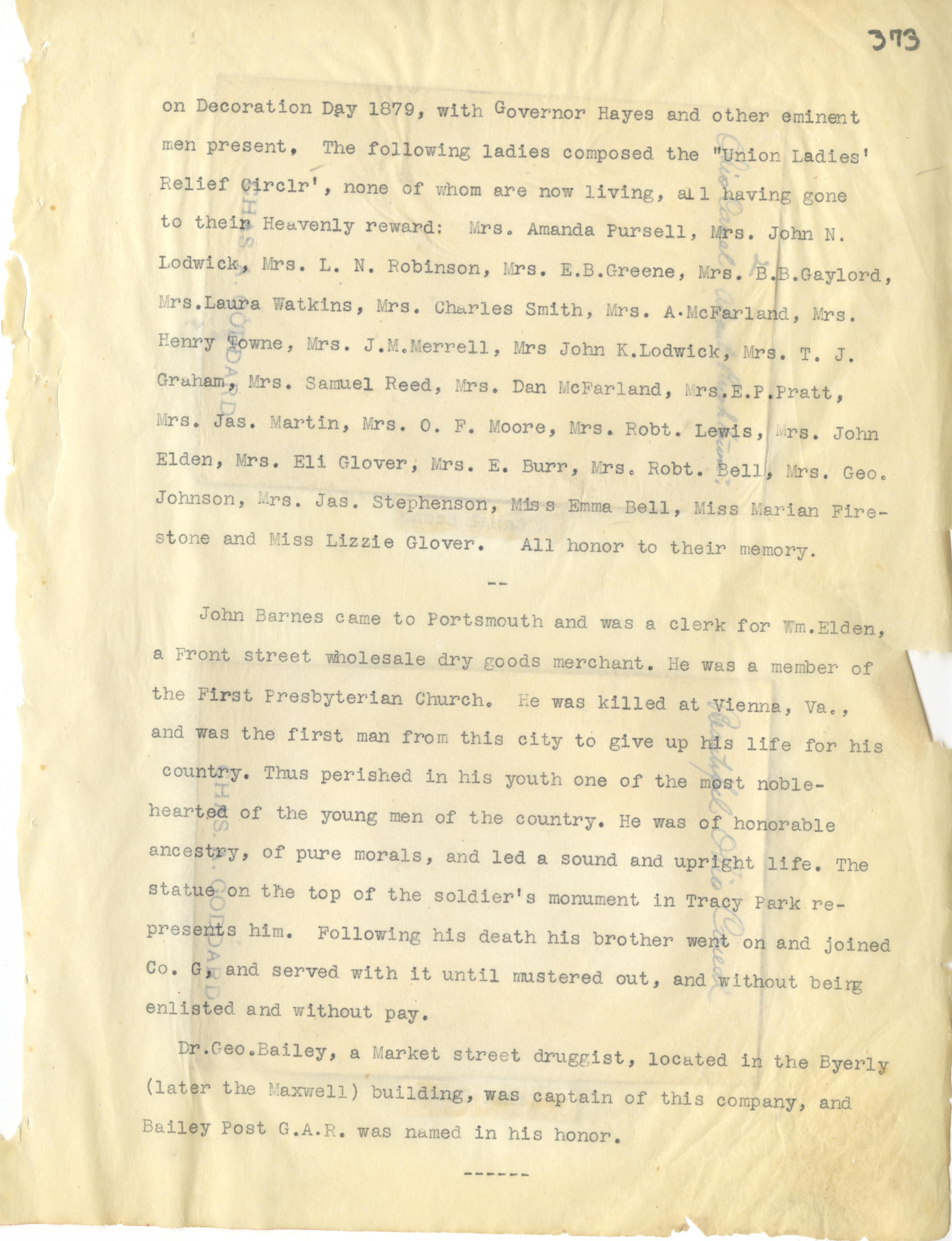 - Photo image of scanned scrapbook page 373. Decoration Day 1879; Governor Hayes; Union Ladies' Relief Circle Names: