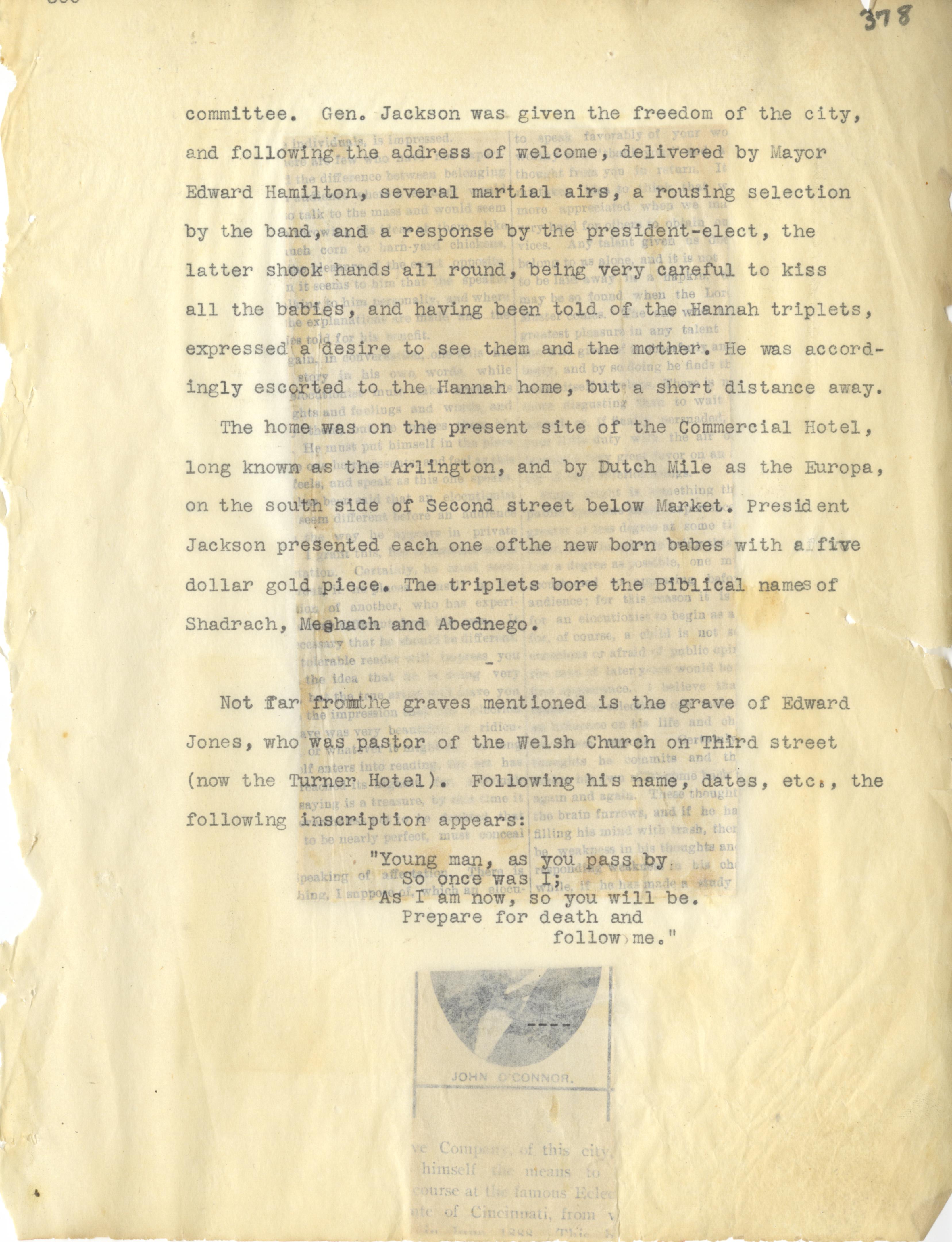 - Photo image of scanned scrapbook page 378. Gen. Jackson; Mayor Edward Hamilton; Hannah Triplets; Commercial Hotel; Arlington; Dutch Mile; Europa; President Jackson; Shadrach; Meshach; Abednego; Edward Jones; Turner Hotel