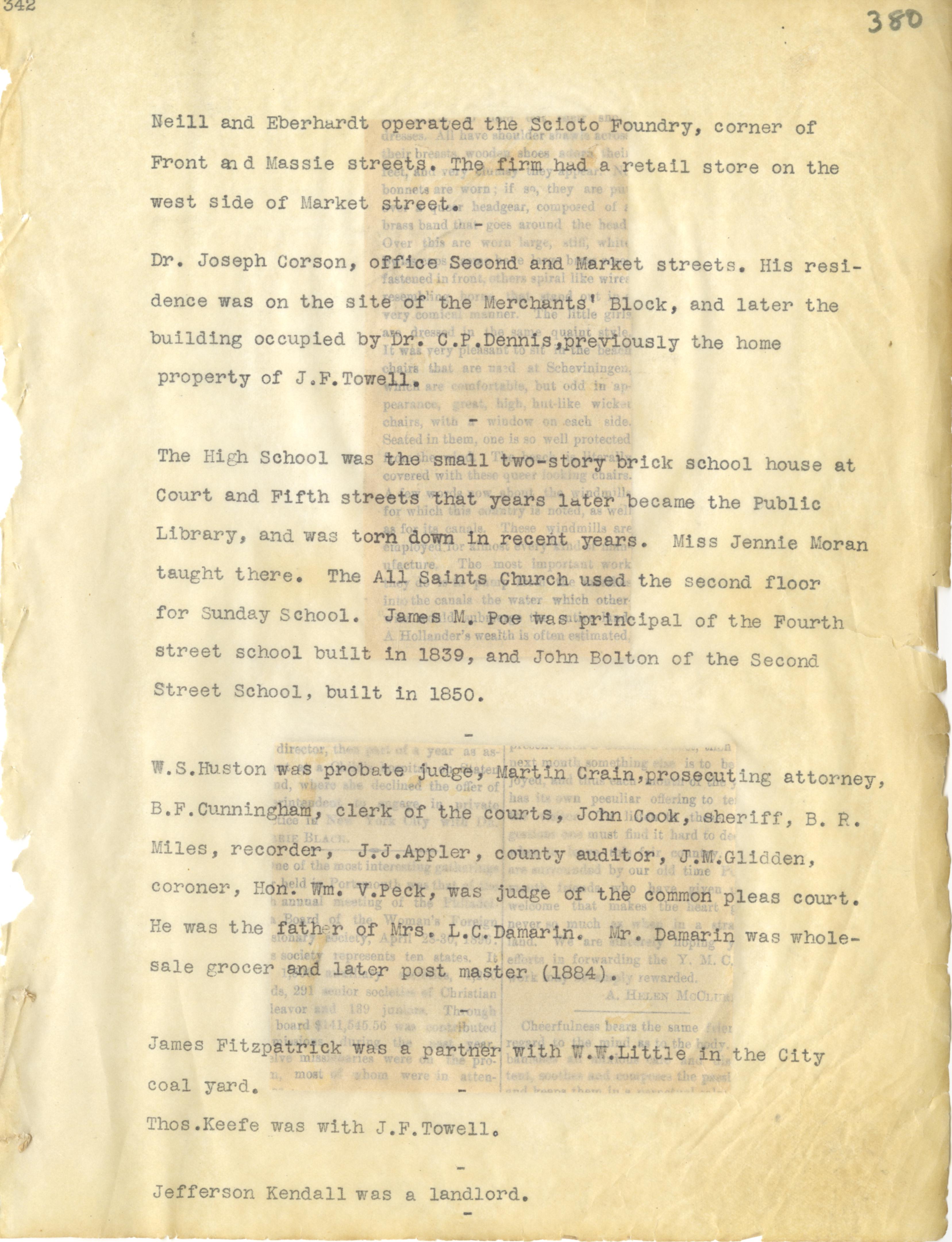 - Photo image of scanned scrapbook page 380. Neill and Eberhardt; Scioto Foundry; Dr. Joseph Corson; Dr. C.P. Dennis; J.F. Towell; The High School; Public Library; Miss Jennie Moran; All Saints Church; James M. Poe (1839); John Bolton (1850); W.S. Huston; Probate Judge; Martin Crain; B.F. Cunningham; John Cook; J.M. Glidden; Hom. William V. Peck; Mrs. L.C. Damarin; Mr. Damarin (1884); James Fitzpatrick; W.W. Little; Thomas Keefe; Jefferson Kendall