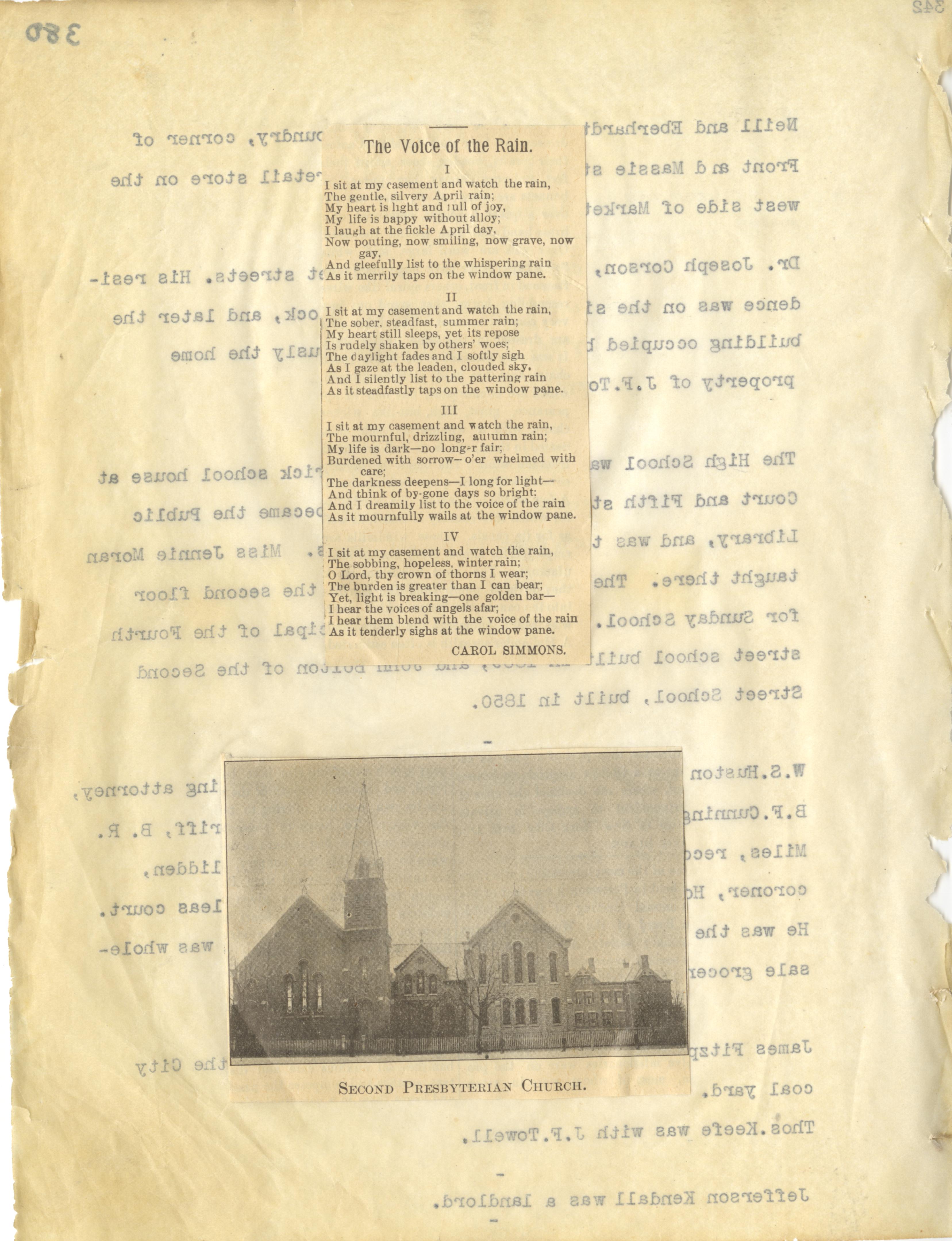 - Photo image of scanned scrapbook page. The Voice in the Rain; Carol Simmons; Second Presbyterian Church