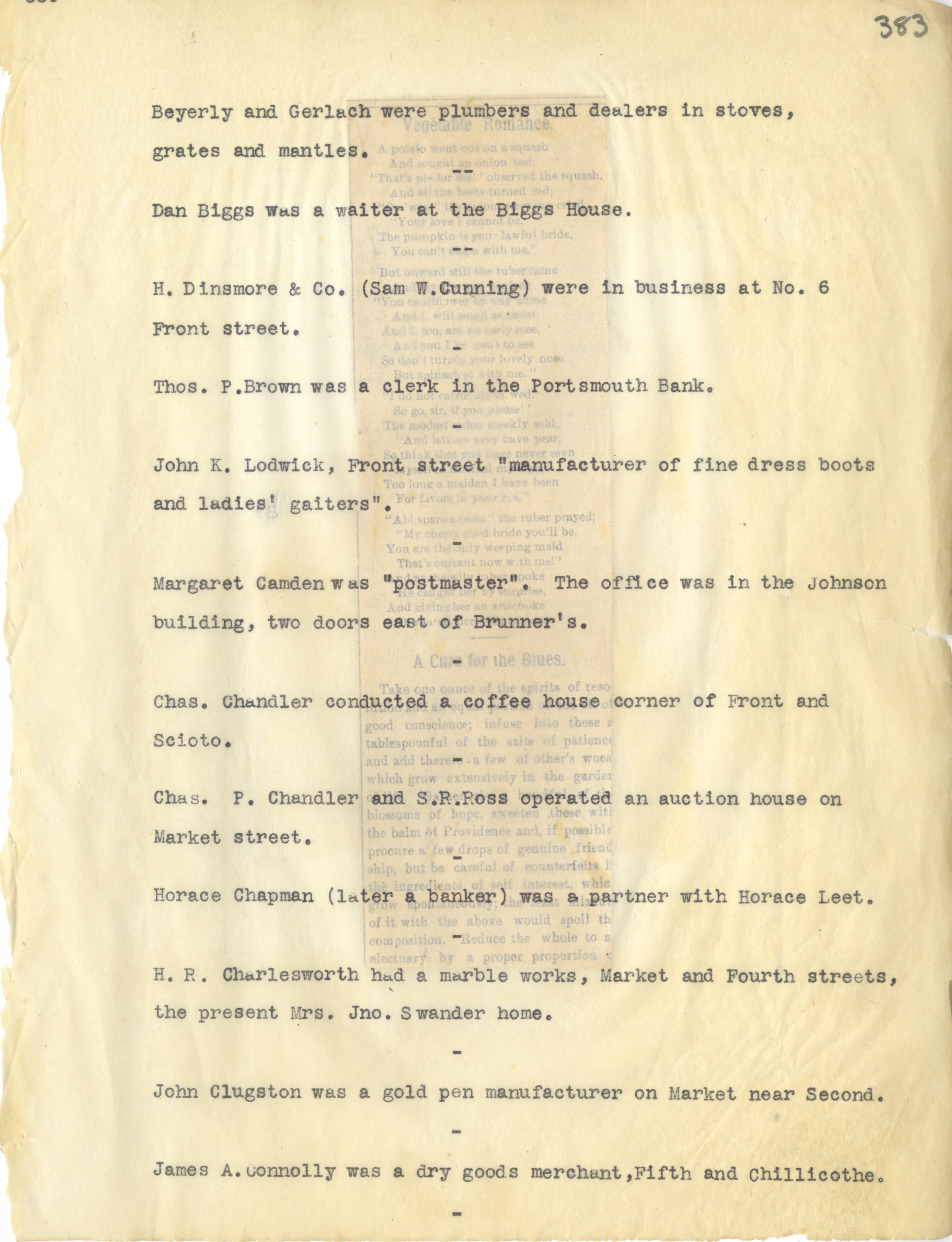 - Photo image of scanned scrapbook page 383. Beyerly and Gerlach; Dan Biggs; Biggs House; H. Dinsmore & Co; Sam W. Cunning; Thomas P. Brown; Portsmouth Bank; John K. Lodwick; Margaret Camden; Johnson; Brunner; Charles Chandler; S.R. Ross; Horace Chapman; Horace Leet; H.R. Charlesworth; Mrs. John Swander; James A. Connolly