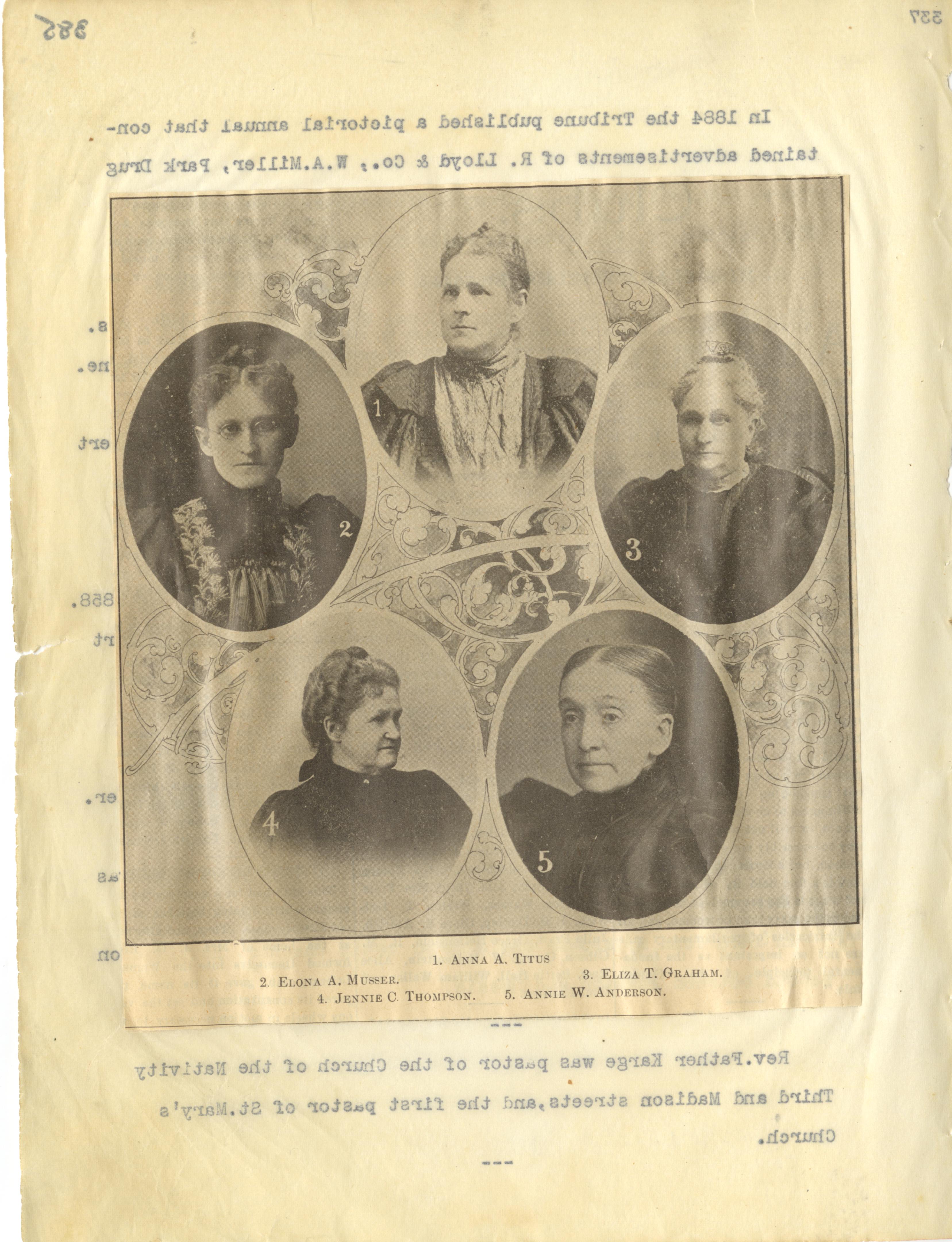 - Photo image of scanned scrapbook page. Anna A. Titus; Elona A. Musser; Eliza T. Graham; Jennie C. Thompson; Annie W. Anderson
