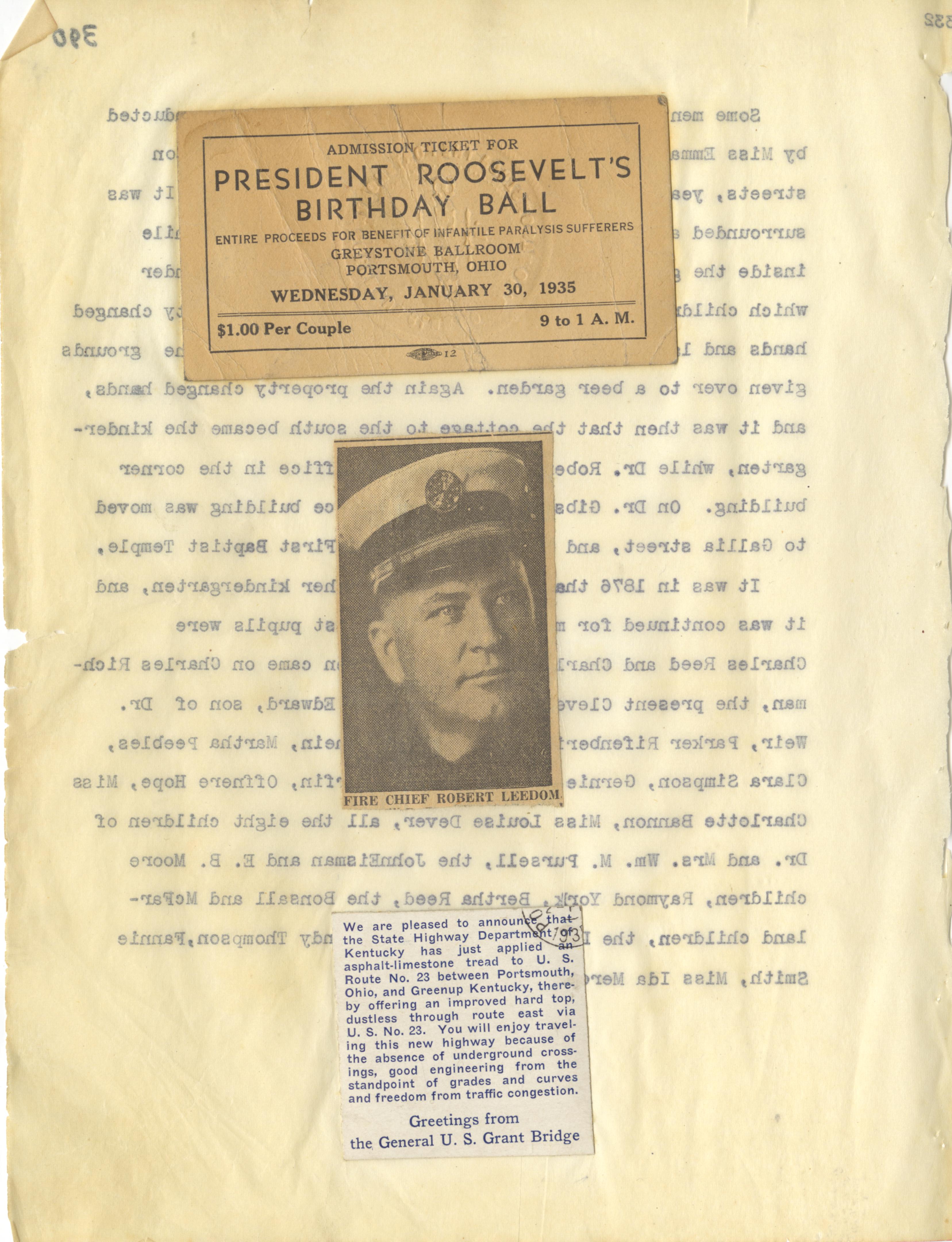 Henry A. Lorberg , “President Roosevelt's Birthday Ball (1935); Fire Chief Robert Leedom; General U.S. Grant Bridge,” Scioto County Public Library Local History Digital Collection, accessed December 13, 2025, https://www.sciotolibrary.org/history/items/show/23472.