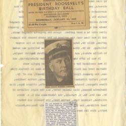 - Photo image of scanned scrapbook page. Pictured is a ticket to President Roosevelt's Birthday Ball (1935); a black and white photo of Fire Chief Robert Leedom; an article about the General U.S. Grant Bridge