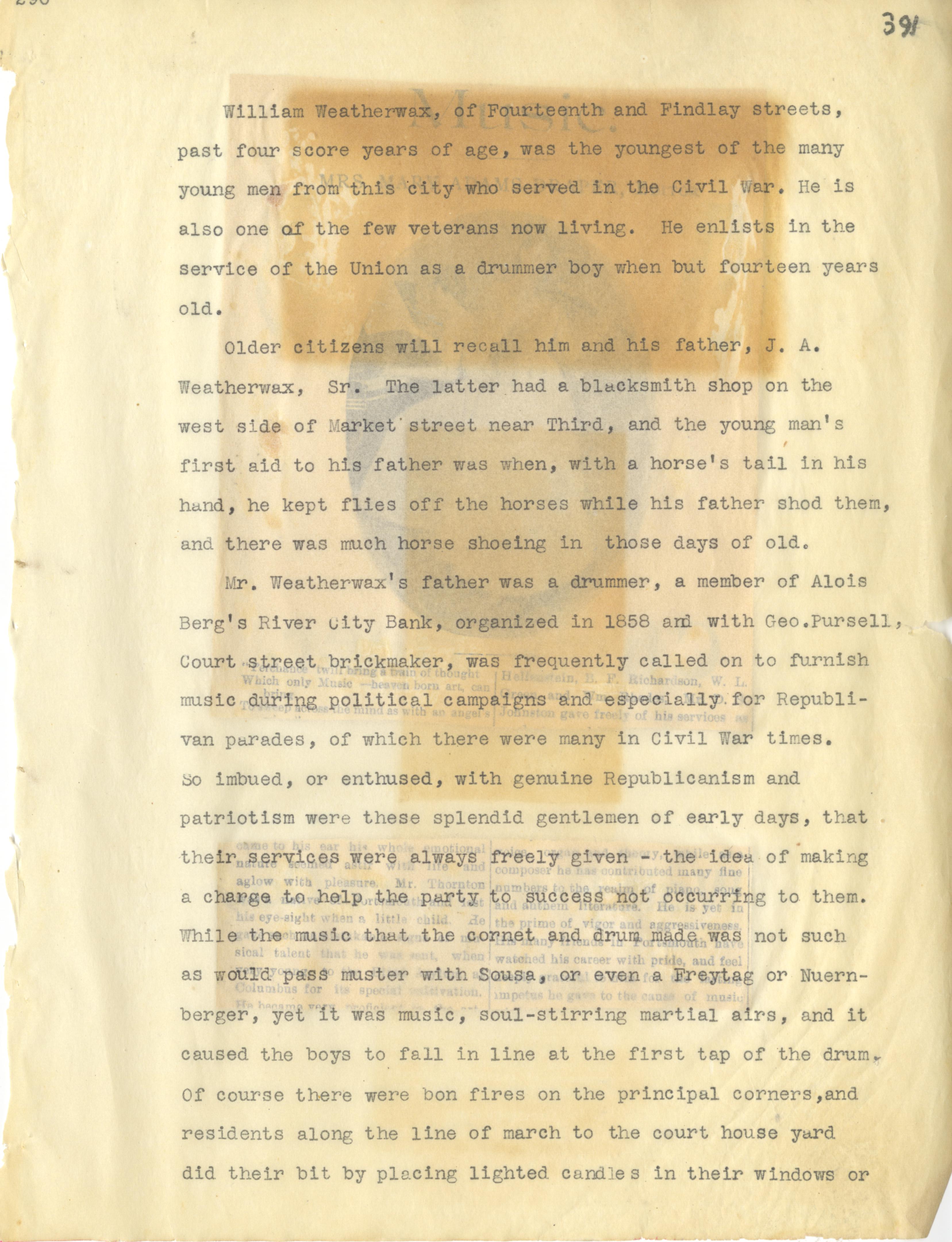 - Photo image of scanned scrapbook page 391. William Weatherwax; Civil War; Union; J.A. Weatherwax Sr; Alois Berg's River City Bank (1858); George Pursell; Sousa; Freytag; Nuernberger