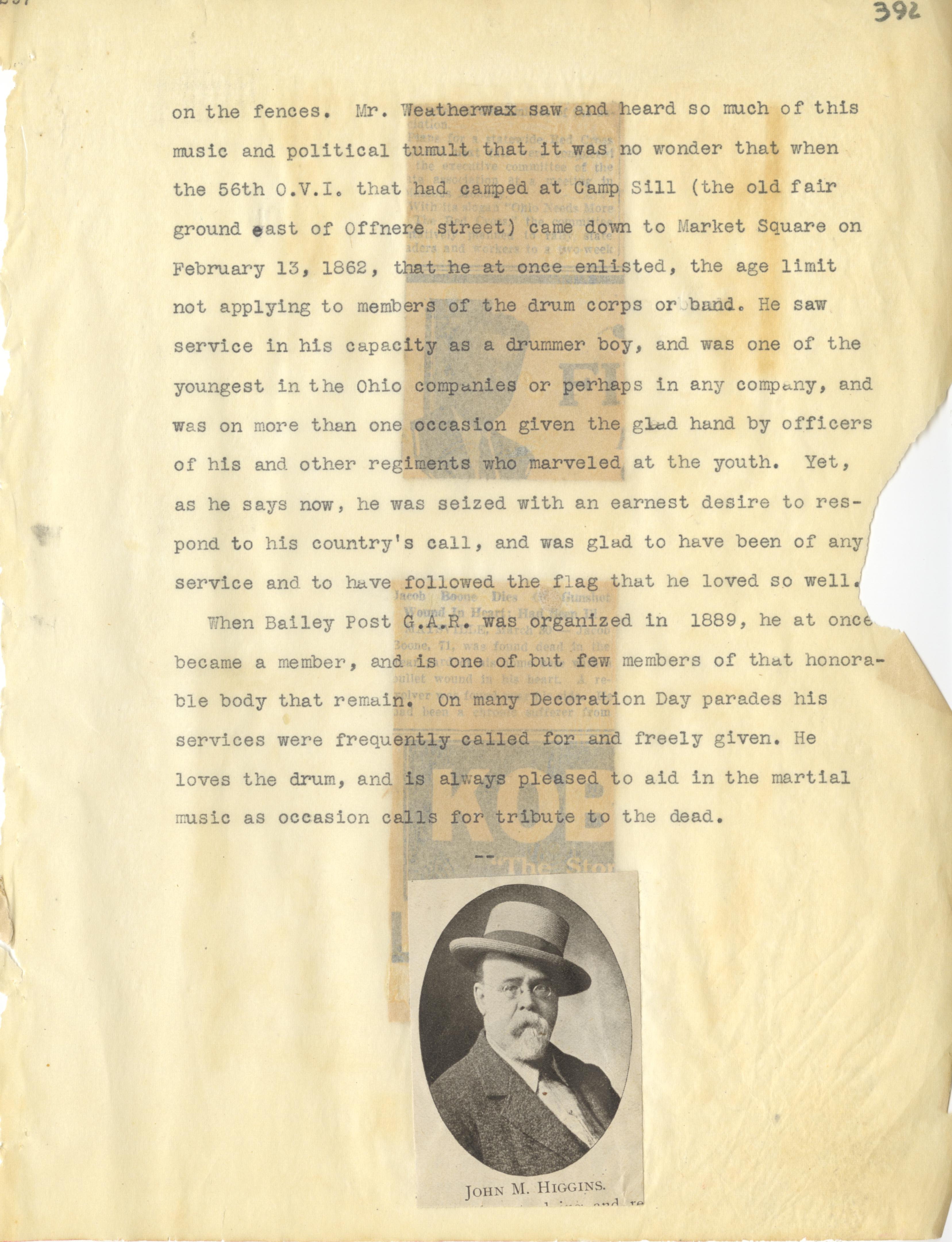 - Photo image of scanned scrapbook page 392. Mr. Weatherwax; 56th O.V.I.; Camp Sill; Market Square (1862); Bailey Post G.A.R. (1889); Decoration Day; John M. Higgins