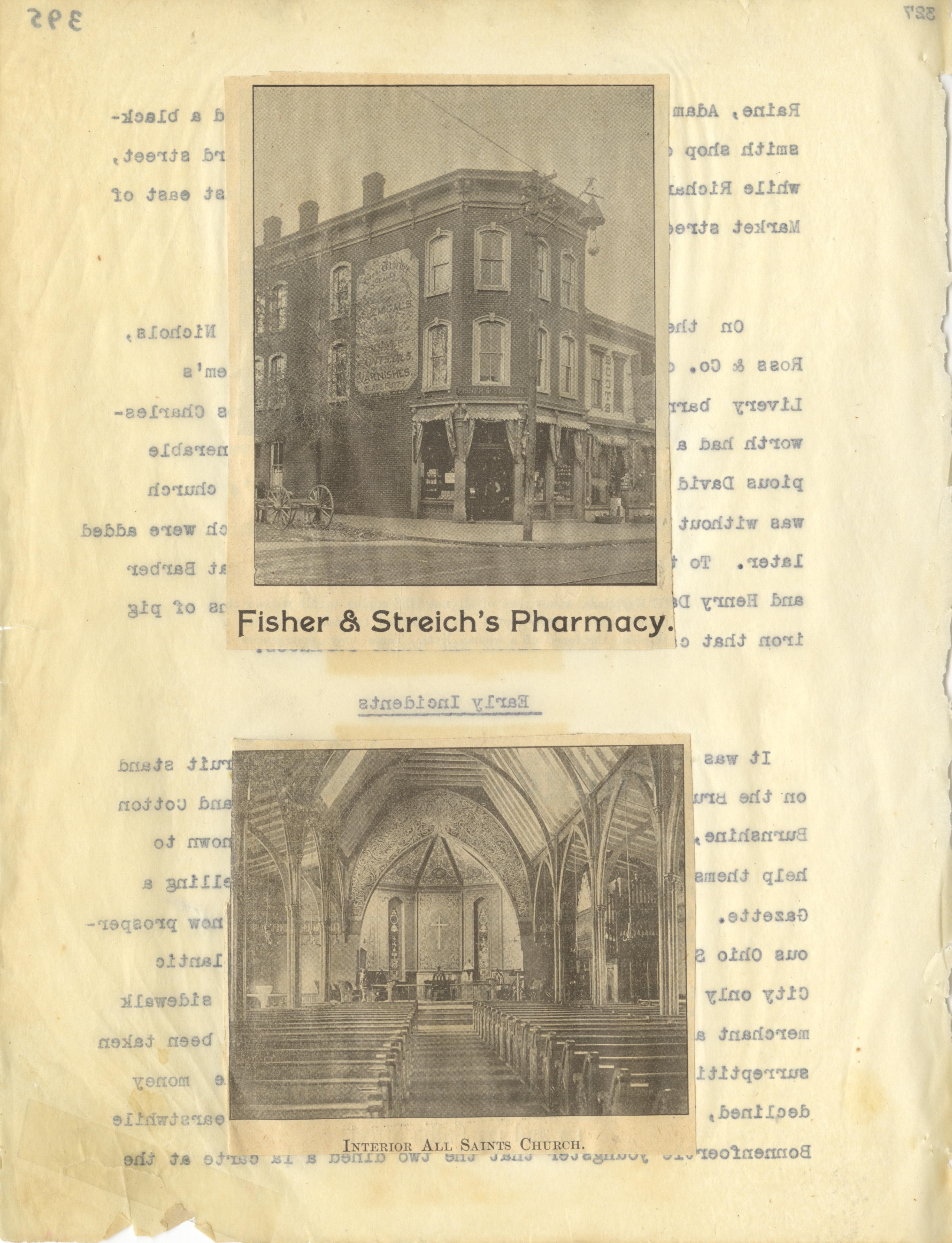 - Photo image of scanned scrapbook page. Fisher & Streich's Pharmacy; Interior All Saints Church