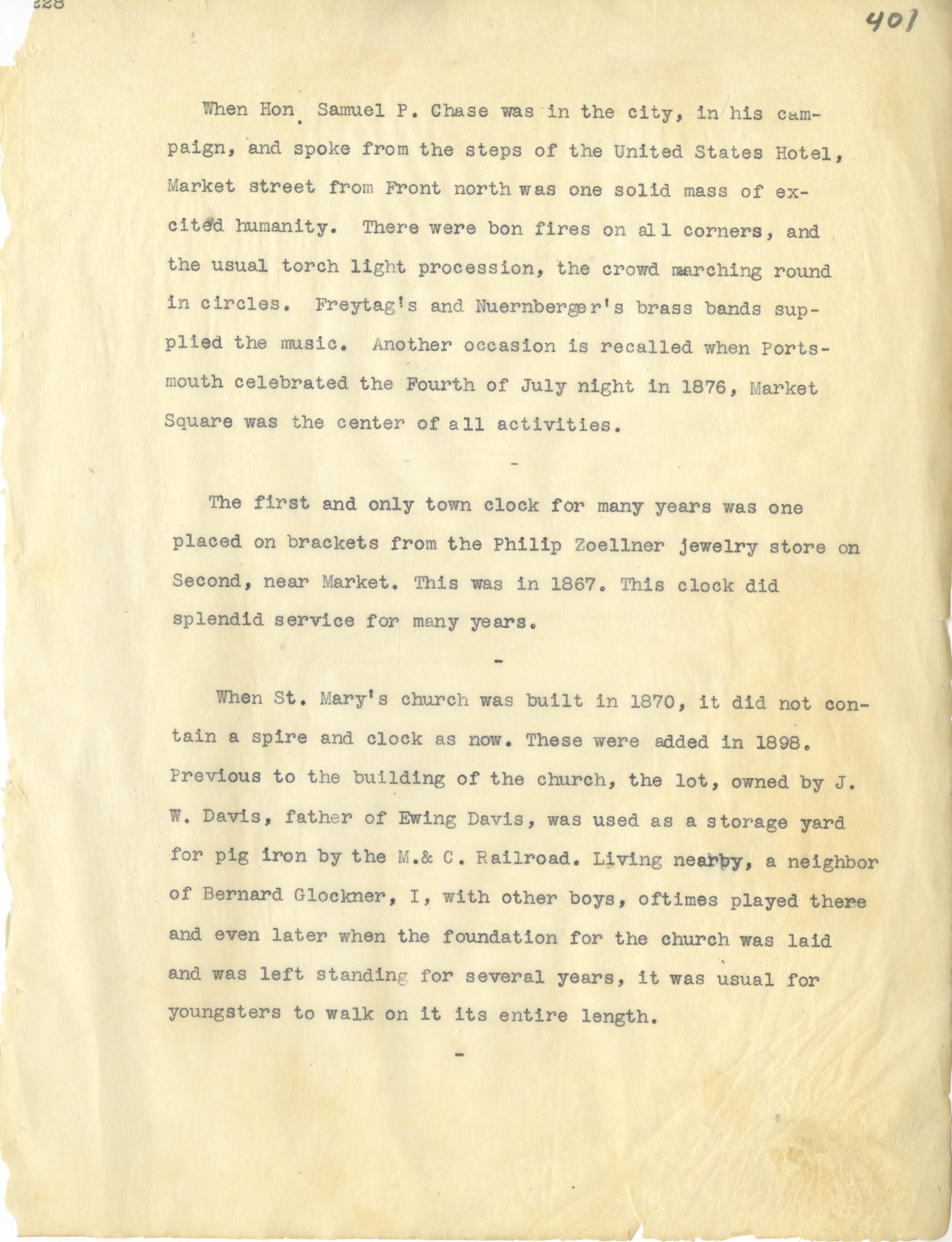- Photo image of scanned scrapbook page 401. Hon. Samuel P. Chase; United States Hotel; Freytag and Nuernberger; Fourth of July (1876); Philip Zoellner (1867); St. Mary's Church (1870); Clock (1898); J.W. Davis; Ewing Davis; Pig Iron; M. & C. Railroad; Bernard Glockner