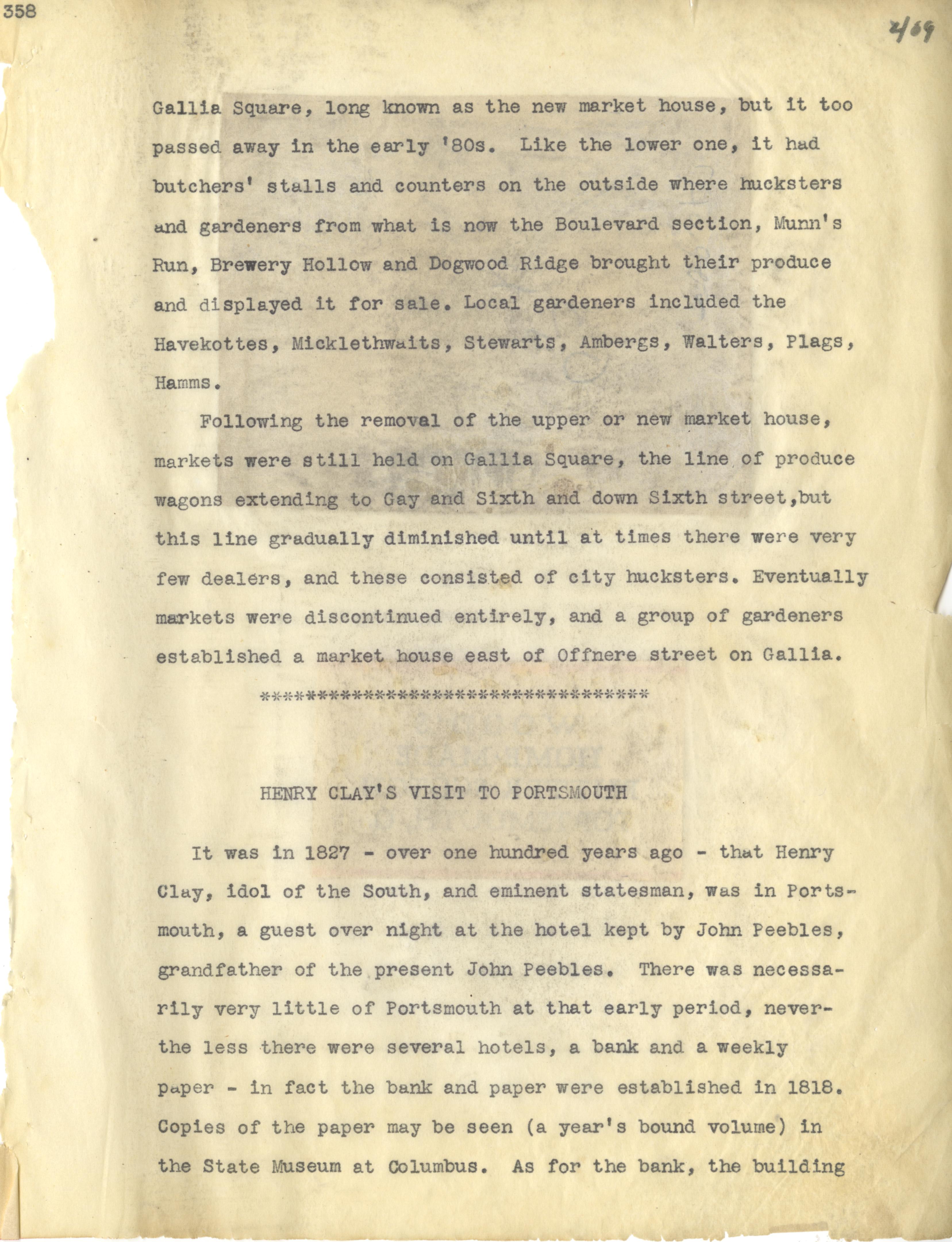 Henry A. Lorberg, “Gallia Square; Munn's Run; Brewery Hollow; Dogwood Ridge; Havekottes; Michlethwaits; Stewarts; Ambergs; Walters; Plags; Hamms; Henry Clay's Visit to Portsmouth; 1827; John Peebles; Hotel; State Museum at Columbus,” Scioto County Public Library Local History Digital Collection, accessed December 7, 2025, https://www.sciotolibrary.org/history/items/show/23506.