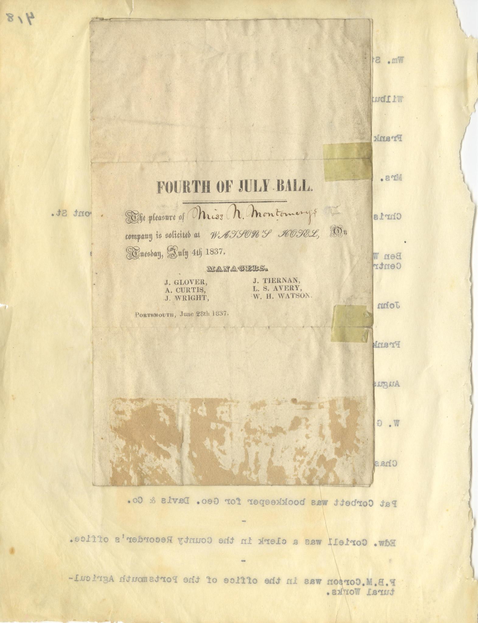 - Photo image of scanned scrapbook page. Fourth of July Ball (1837); Miss N. Montomery; Watson's Hotel