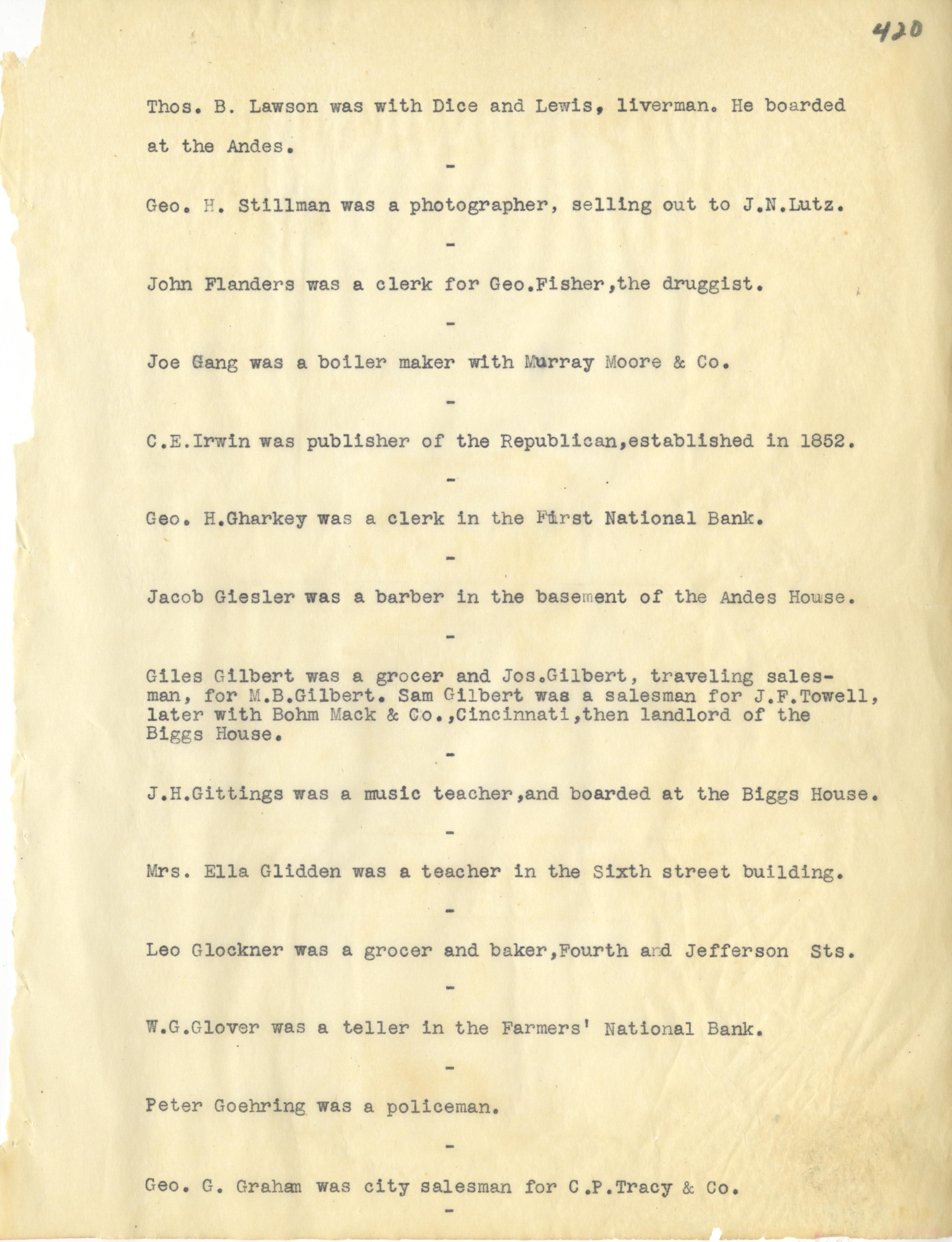 - Photo image of scanned scrapbook page 420. Thomas B. Lawson; Dice and Lewis; Andes; George H. Stillman; J.N. Lutz; John Flanders; George Fisher; Joe Gang; Murray Moore & Co; C.E. Irwin; Republican (1852); George H. Gharkey; First National Bank; Jacob Giesler; Giles Gilbert; Joseph Gilbert; M.B. Gilbert; J.F. Towell; Bohm Mack & Co; Biggs House; J.H. Gittings; Biggs House; Mrs. Ella Glidden; Leo Glockner; W.G. Glover; Farmers' National Bank; Peter Goehring; George G. Graham; C.P. Tracy & Co
