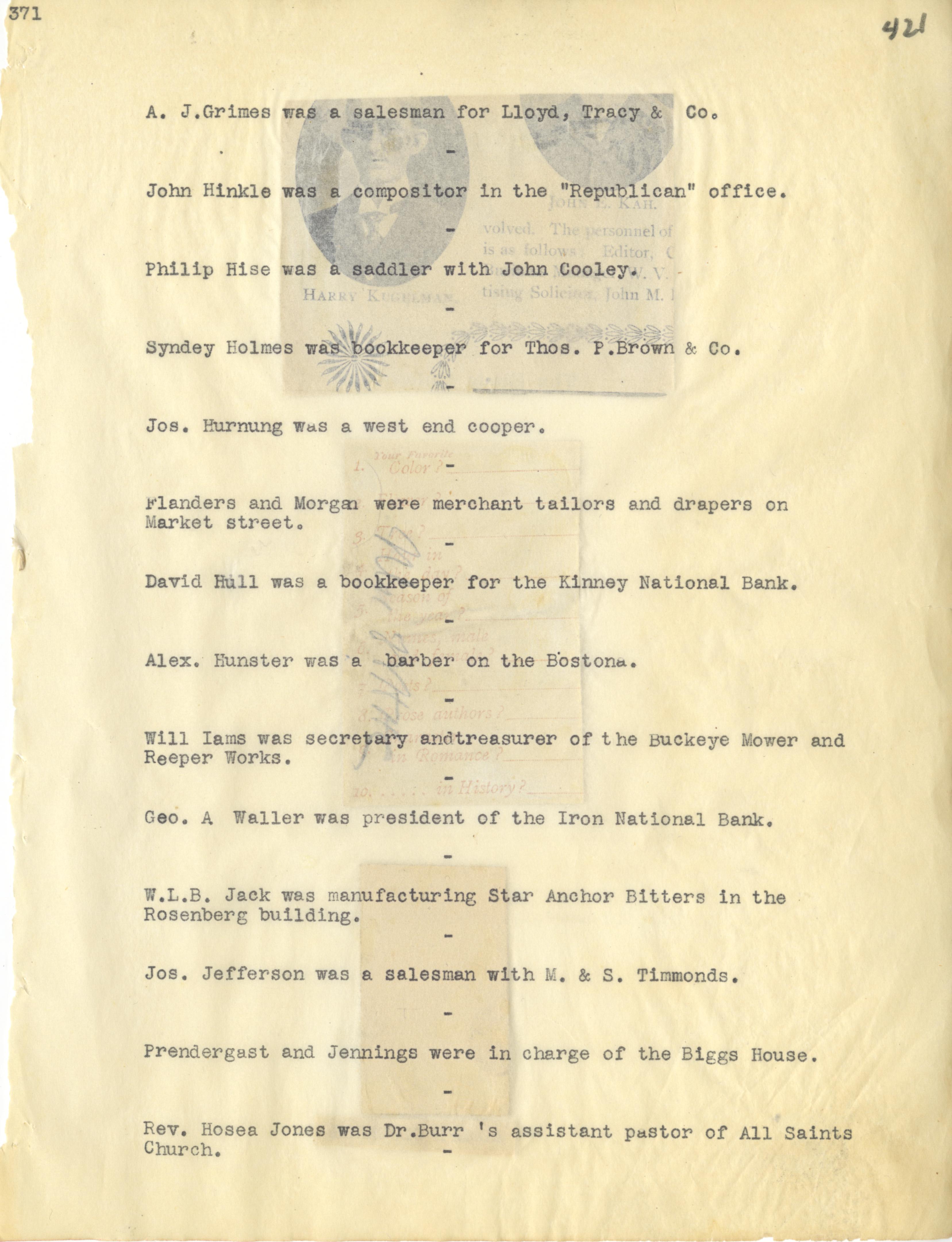 - Photo image of scanned scrapbook page 421. A.J. Grimes; Lloyd, Tracy & Co; John Hickle; Republican Office; Philip Hise; John Cooley; Syndey Holmes; Thomas P, Brown & Co; Joseph Hurnung; Flanders and Morgan; David Hall; Kinney National Bank; Alex Hunster; Bostona; Will Iams; Buckeye Mower; Reeper Works; George A. Waller; Iron Nation Bank; W.L.B. Jack; Star Anchor Bitters; Rosenberg Building; Joseph Jefferson; M. & S. Timmonds; Prendergast and Jennings; Biggs House; Rev. Hosea Jones; Dr. Burr's; All Saints Church
