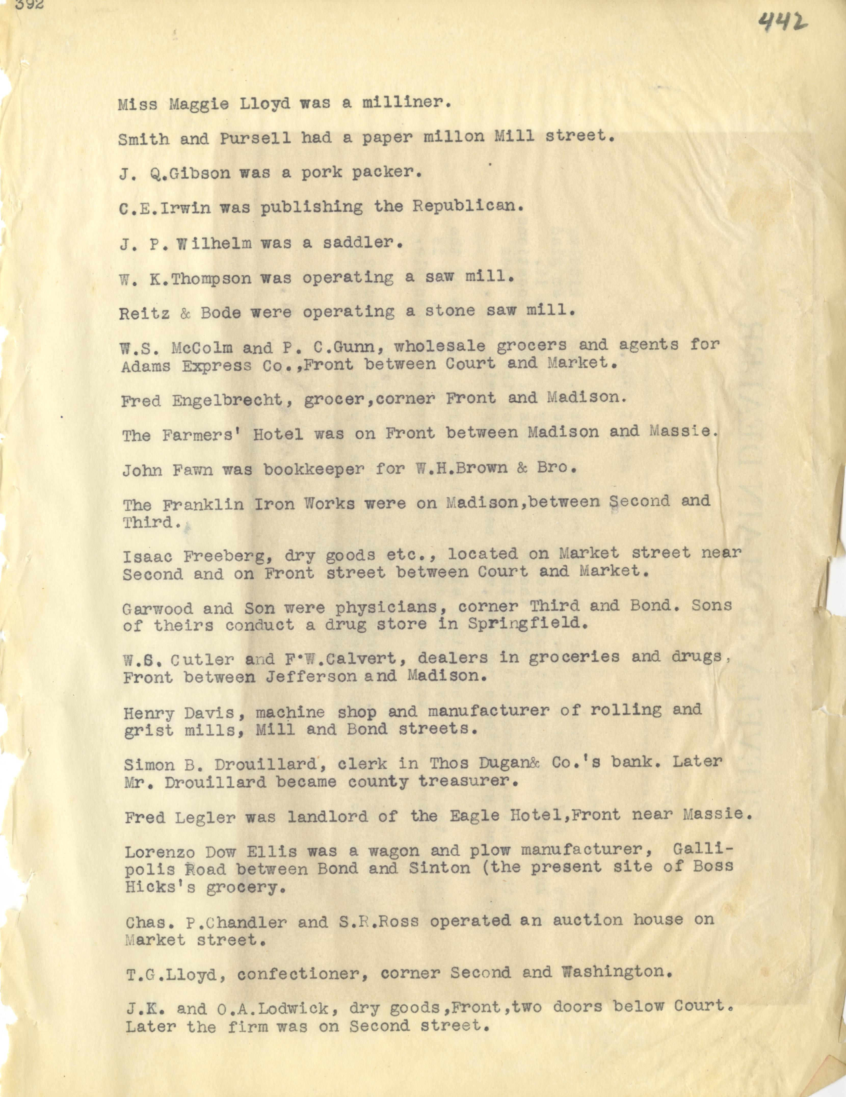 - Photo image of scanned scrapbook page 442. Miss Maggie Lloyd; Smith and Pursell; J.Q. Gibson; C.E. Irwin; J.P. Wilhelm; W.K. Thompson; Saw Mill; W.S. McColm; P.C. Gunn; Adams Express Co; Fred Engelbrecht; The Farmers Hotel; John Fawn; W.H. Brown & Bro; The Franklin Iron Works; Isaac Freeberg; Garwood and Son; W.S. Cutler; F.W. Calvert; Henry Davis; Simon B. Drouillard; Thomas Dugan;& Co; County Treasurer; Fred Legler; Eagle Hotel; Lorenzo Dow Ellis; Boss Hick's Grocery; Charles P. Chandler; S.R. Ross; T.G. Lloyd; J.K. and O.A. Lodwick