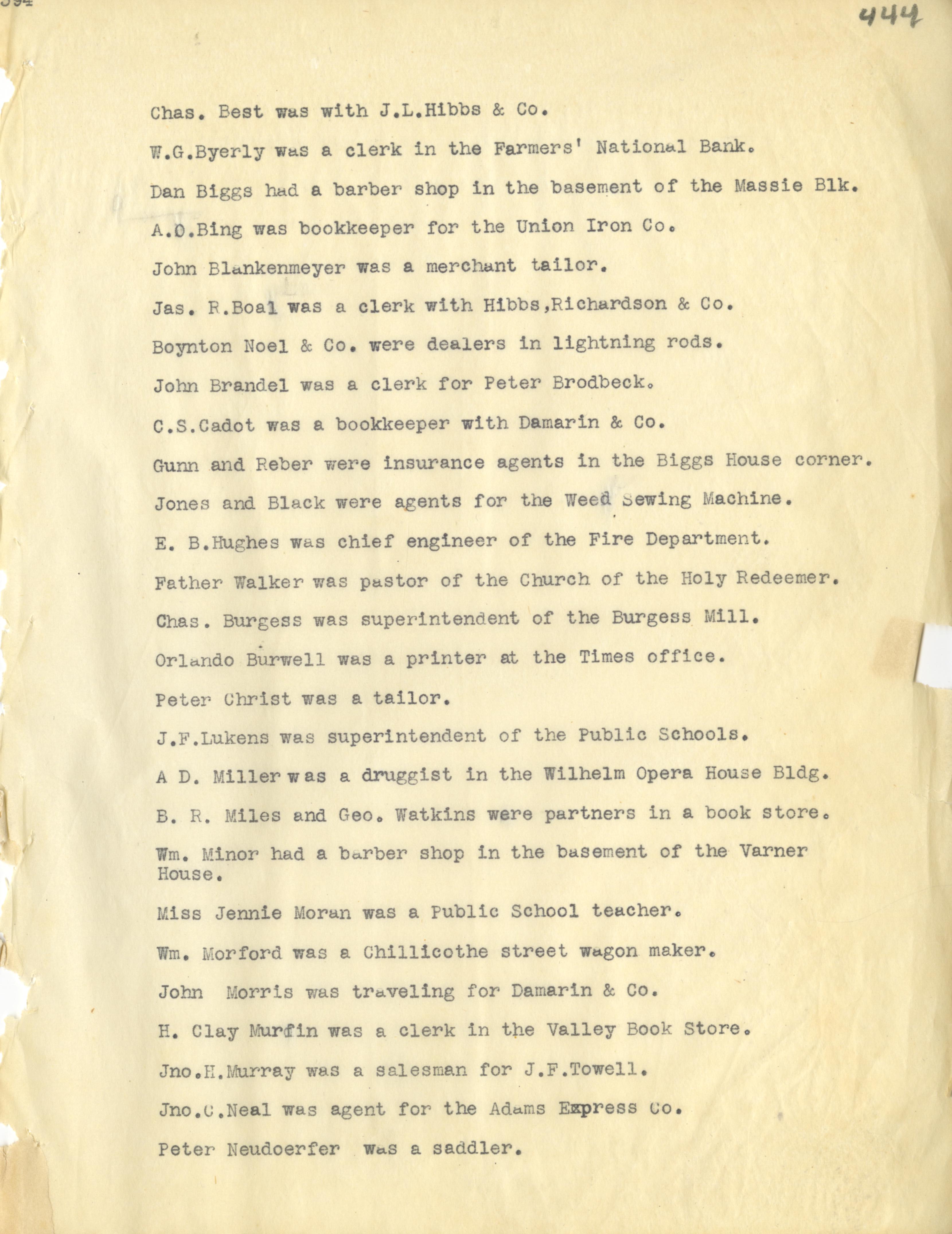 - Photo image of scanned scrapbook page 444. Charles Best; J.L. Hibbs & Co; W.G. Byerly; Farmers' National Bank; Dan Biggs; Massie Blk.; A.O. Bing; Union Iron Co; John Blankenmeyer; James R. Boal; Boynton Noel & Co; Hibbs, Richardson &Co; John Brandel; Peter Brandel; C.S. Cadot; Damarin & Co; Gunn and Reber; Biggs House; Jones and Black; Weed Sewing Machine; E.B. Hughes; Fire Department; Father Walker; Church of the Holy Redeemer; Charles Burgess; Burgess Mill; Orlando Burwell; The Times Office; Peter Christ; J.F. Luckens; Public Schools; A.D. Miller; Wilhelm Opera House Bldg; B.R. Miles; George Watkins; William Minor; Varner House; Miss Jennie Moran; William Morford; John Morrie; Daramin & Co; H. Clay Murfin; Valley Book Store; John H. Murray; J.F. Towell; John C. Neal; Peter Neudoerfer