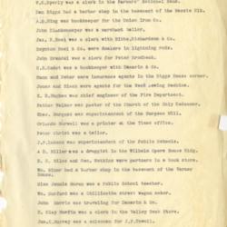 - Charles Best; J.L. Hibbs & Co; W.G. Byerly; Farmers' National Bank; Dan Biggs; Massie Blk.; A.O. Bing; Union Iron Co; John Blankenmeyer; James R. Boal; Boynton Noel & Co; Hibbs, Richardson &Co; John Brandel; Peter Brandel; C.S. Cadot; Damarin & Co; Gunn and Reber; Biggs House; Jones and Black; Weed Sewing Machine; E.B. Hughes; Fire Department; Father Walker; Church of the Holy Redeemer; Charles Burgess; Burgess Mill; Orlando Burwell; The Times Office; Peter Christ; J.F. Luckens; Public Schools; A.D. Miller; Wilhelm Opera House Bldg; B.R. Miles; George Watkins; William Minor; Varner House; Miss Jennie Moran; William Morford; John Morrie; Daramin & Co; H. Clay Murfin; Valley Book Store; John H. Murray; J.F. Towell; John C. Neal; Peter Neudoerfer