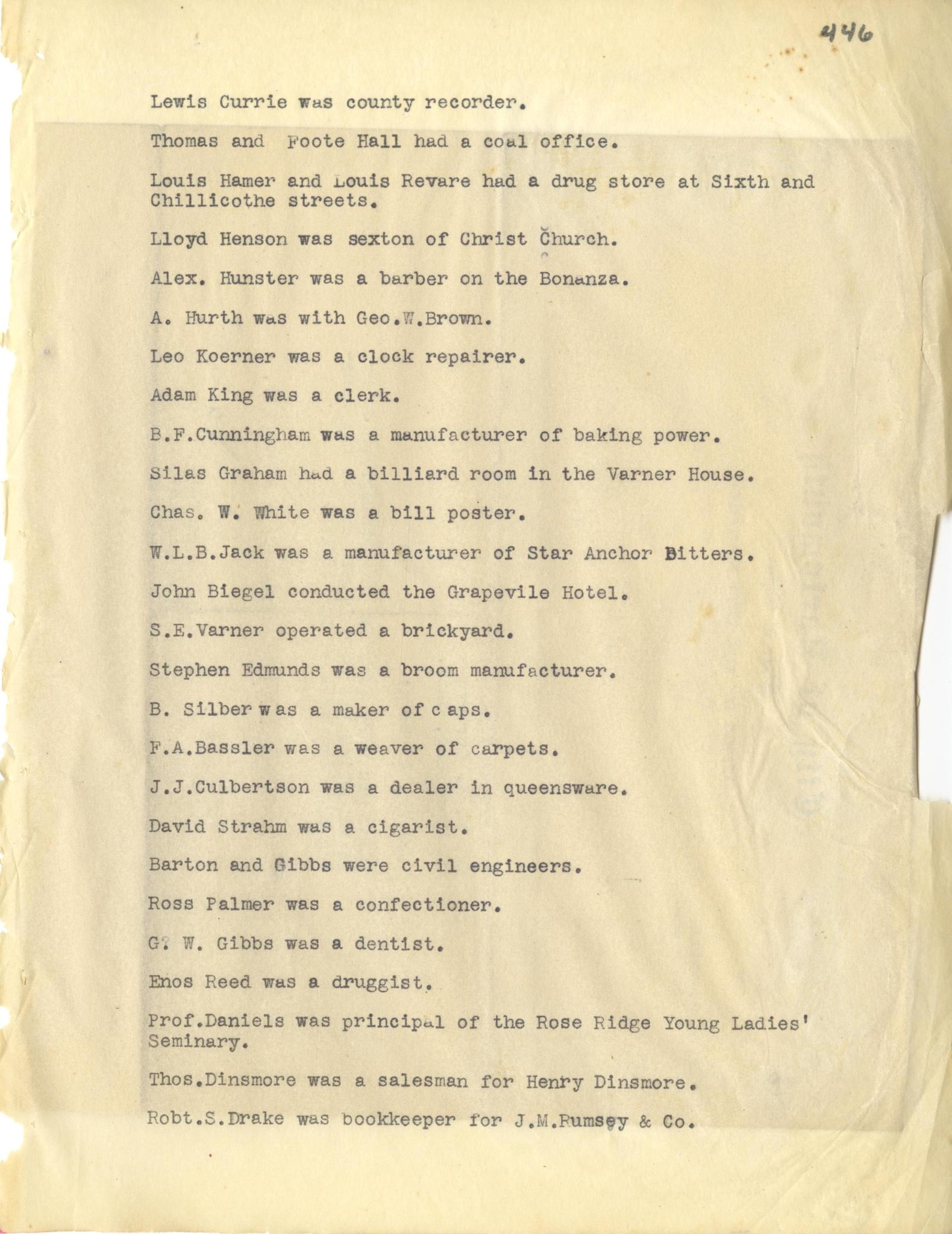 - Photo image of scanned scrapbook page 446. Lewis Currie; Thomas and Foote Hall; Louis Hamer; Louis Revare; Lloyd Henson; Sexton; Christ Church; Alex Hunster; Bonanza; A. Hurth; George W. Brown; Leo Koerner; Adam King; B.F. Cunningham; Silas Graham; Varner House; Chas. W. White; W.L.B. Jack' Star Anchor Bitters; John Biegel; Grapevile Hotel; S.E. Varner; Stephen Edmunds; S. Bilber; F.A. Bassler; J.J. Culbertson; David Strahm; Barton and Gibbs; Ross Palmer; G.W. Gibbs; Enos Reed; Prof. Daniels; Rose Ridge Young Ladies' Seminary; Thomas Dinsmore; Henry Dinsmore; Robt. S. Drake; J.M. Rumsery & Co