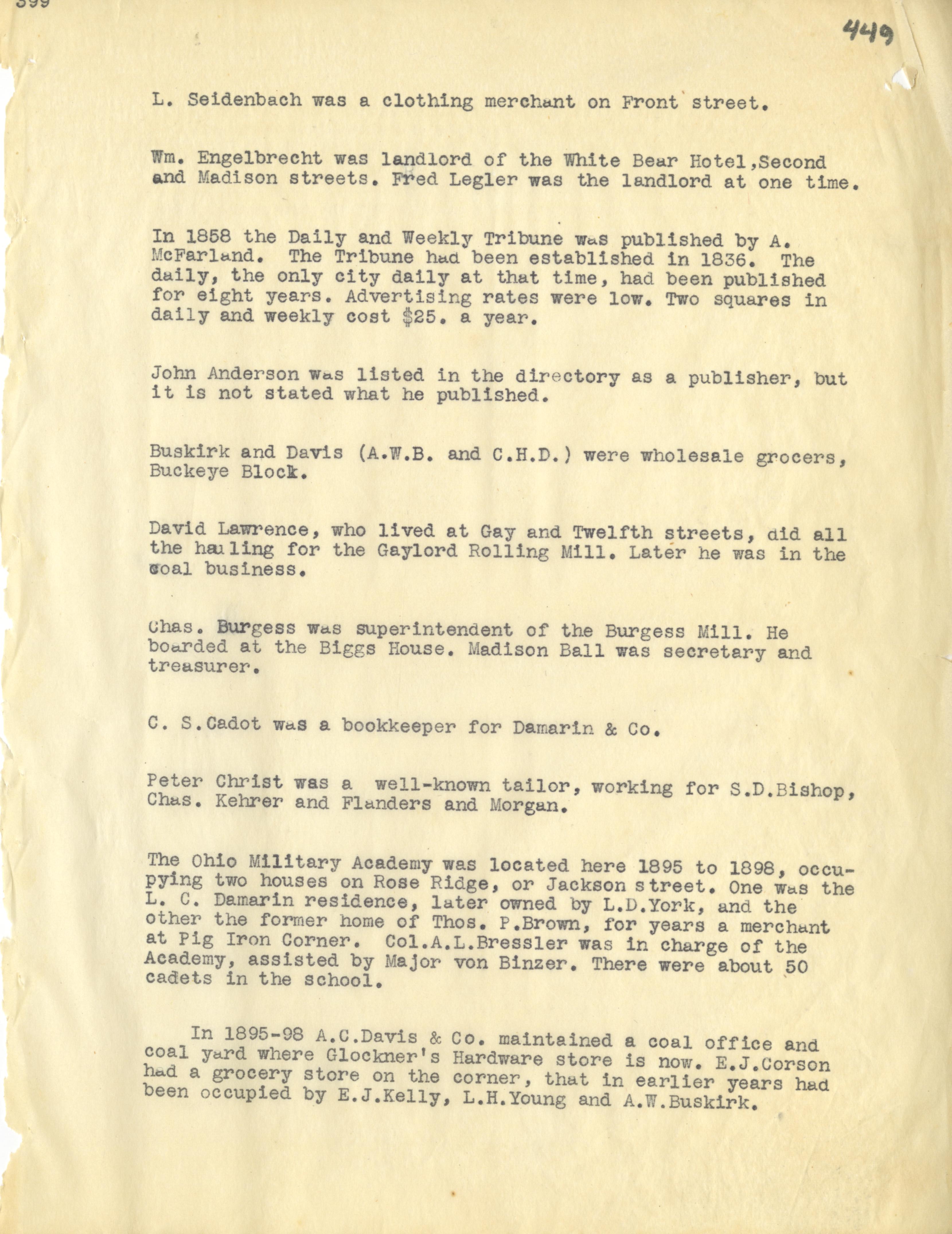 - Photo image of scanned scrapbook page 449. L. Seidenback; William Engelbrecht; White Bear Hotel; Fred Legler; Daily and Weekly Tribune (1858); The Tribune (1836); John Anderson; Buskirk and Davis; A.W.B.; C.H.D.; Buckeye Block; David Lawrence; Gaylord Rolling Mill; Chas. Burgess; Burgess Mill; Biggs House; Madison Ball; C.S. Cadot; Damarin & Co; Peter Christ; S.D. Bishop; Charles Kehreer; Flanders and Morgan; The Ohio Military Academy (1895-1898); Rose Ridge; Jackson Street; L.C. Damarin; L.D. York; Thomas P. Brown; Pig Iron Corner; Col. A.L. Bressler; Major van Binzer; A.C. Davis & Co (1895-1898); Glockner's Hardware Store; E.J. Corson; E.J. Kelly; L.H. Young; A.W. Buskirk