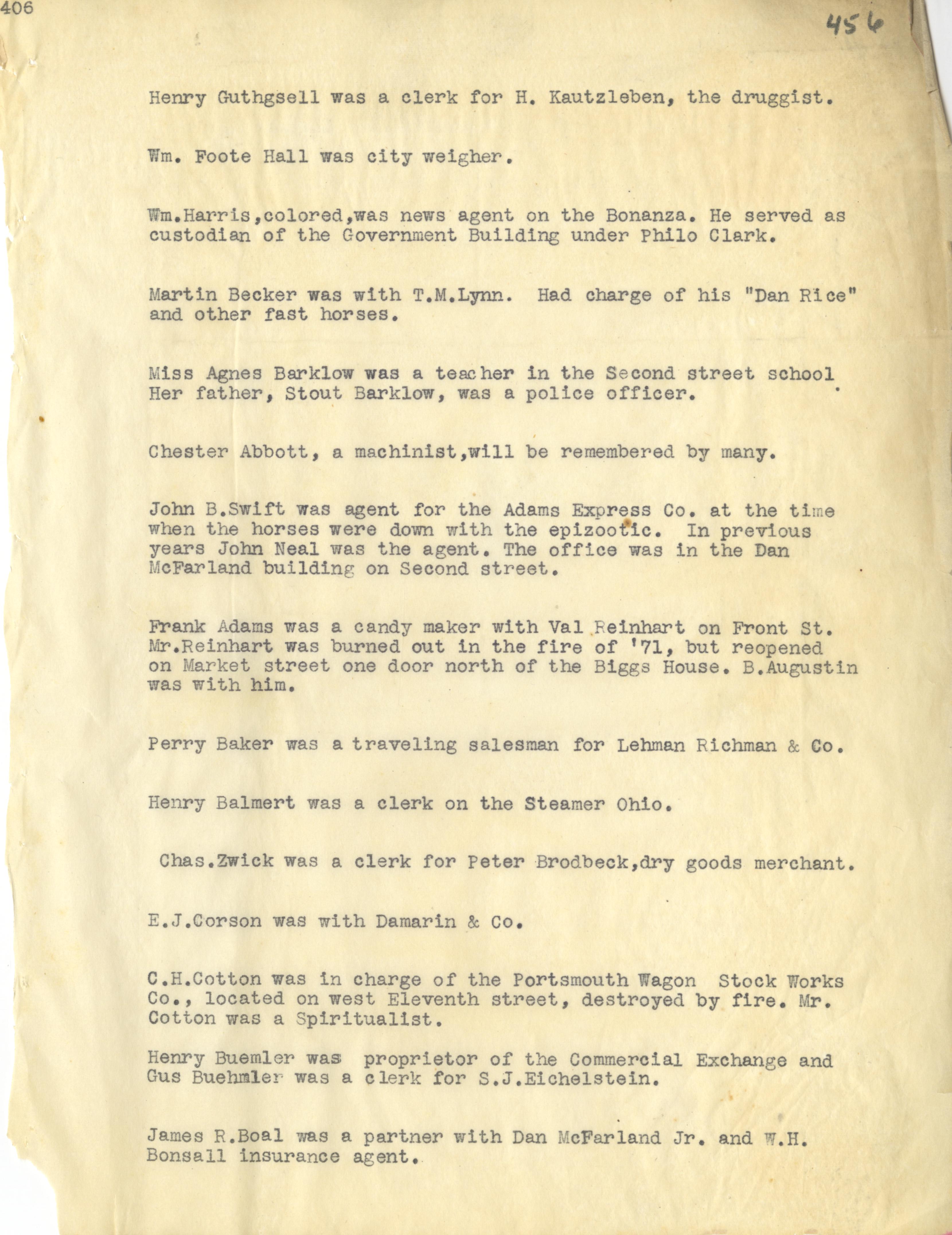 - Photo image of scanned scrapbook page 456. Henry Guthgsell; H. Kautzleben; William Foote Hall; William Harris; Bonanza; Philo Clark; Martin Becker; T.M. Lynn; Dan Rice; Miss Anges Barklow; Second (2nd) Street School; Stout Barklow; Chester Abbott; John B. Swift; Adams Express Co; Dan McFarland; Frank Adams; Val Reinhart; Biggs House; B. Augustin; Perry Baker; Lehman Richman & Co; Henry Balmert; Steamer Ohio; Charles Zwick; Peter Brodbeck; E.J. Corson; C.H. Cotton; Portsmouth Wagon Stock Works Co; Henry Buehmler; Commercial Exchange; Gus Buehmler; S.J. Eichelstein; James R. Boal; Dan McFarland Jr; W.H. Bonsall