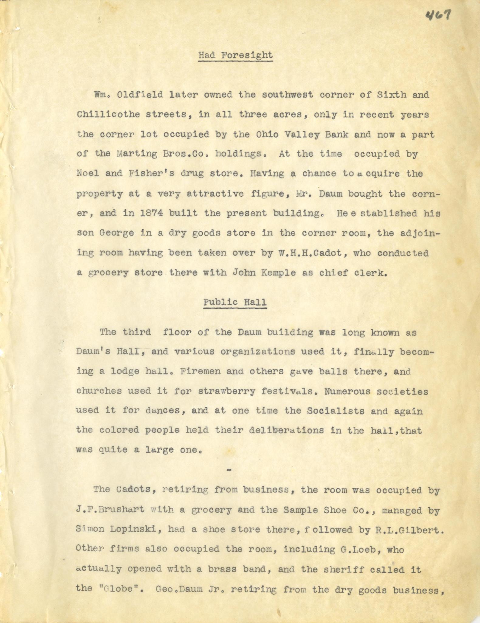 - Photo image of scanned scrapbook page 467. Had Foresight; William Oldfield; Ohio Valley Bank; Marting Bros. Co; Noel and Fisher's Drug Store; Mr. Daum (1874); George; W.H.H. Cadot; John Kemple; Public Hall; Daum's Hall; Strawberry Festivals; The Cadots; J.F. Brushart; Sample Shoe Co; Simon Lopinski; R.L. Gilbert; G. Loeb; The Globe; George Daum Jr