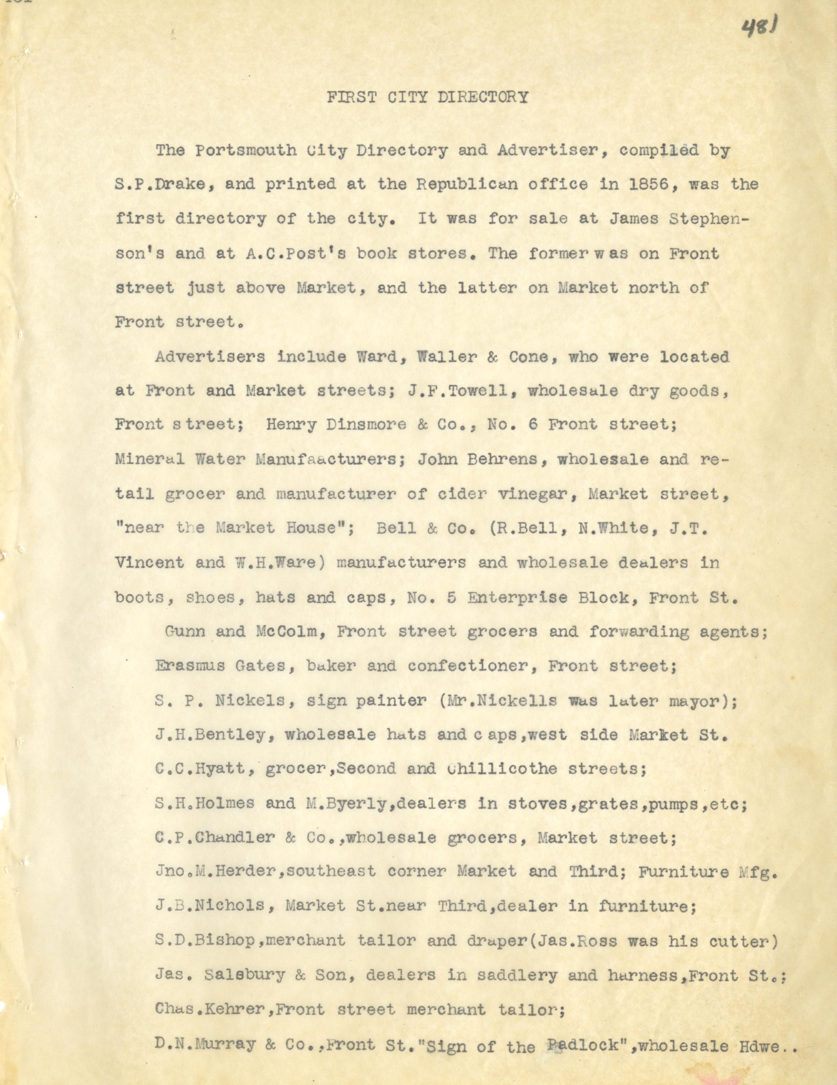 Henry A. Lorberg, “First City Directory (1856); S.P. Drake; Republican Office; A.C. Post; Ward, Waller & Cone; J.F. Towell; Henry Dinsmore & Co; Mineral Water Manufacturers; John Behrens; Bell & Co; R. Bell; N. White; J.T. Vincent; W.H. Are; Gunn and McColm; Erasmus Gates; S.P. Nickels; J.H. Bentley; C.C. Hyatt; S.H. Holmes; C.P. Changle & Co; John M. Herder; J.B. Nichols; S.D. Bishop; James Salsbury & Son; Charles Kehrer; D.N. Murray,” Scioto County Public Library Local History Digital Collection, accessed December 14, 2025, https://www.sciotolibrary.org/history/items/show/23606.