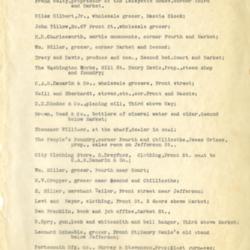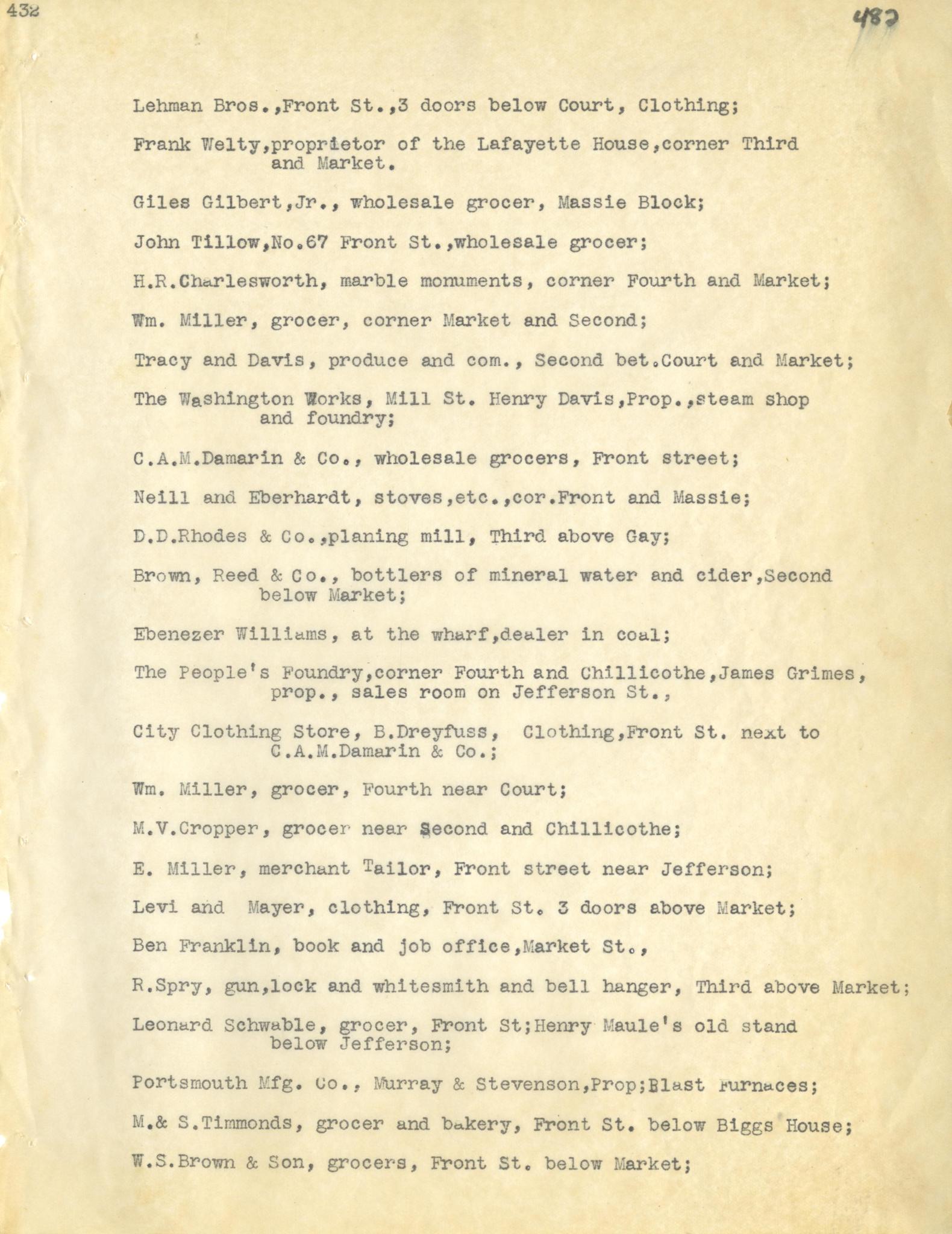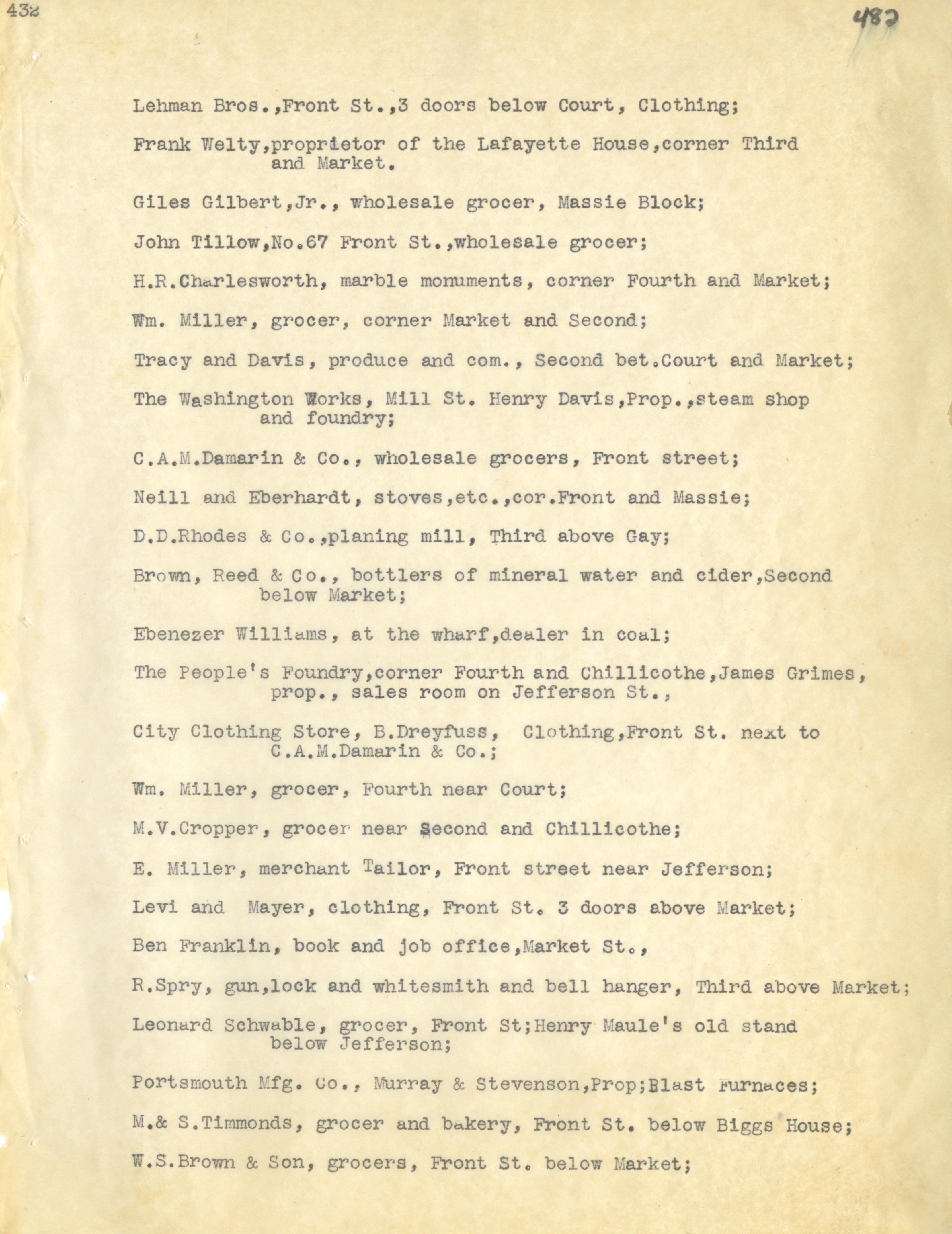 - First City Directory (1856) Cont; Lehman Bros; Front Street; Frank Welty; Lafayette House; Giles Gilbert Jr; Massie Block; John Tillow; H.R. Charlesworth; Wm. Miller; Tracy and Davis; The Washington Works; Henry Davis; Steam Shop and Foundry; C.A.M. Damarin & Co; Neill and Eberhardt; D.D. Rhodes & Co; Brown, Reed, & Co; Ebenezer Williams; The People's Foundry; City Clothing Store; B. Dreyfuss; James Grimes; Wm. Miller; M.V. Cropper; E. Miller; Levi and Mayer; Ben Franklin; R. Spry; Leonard Schwable; Henry Maule's Old Stand; Portsmouth Mfg. Co; Murray & Stevenson; M. & S. Timmonds; W.S. Brown & Son