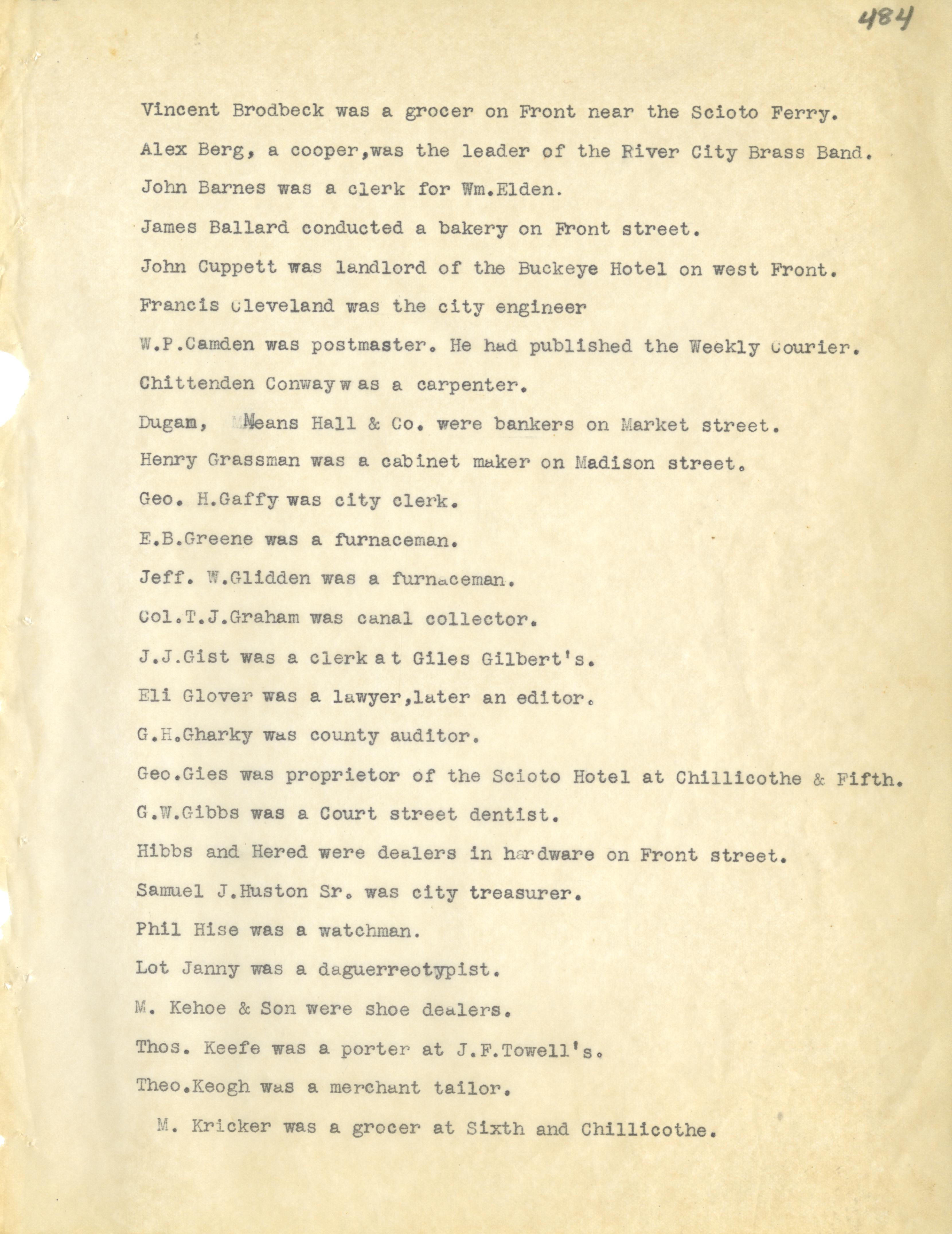 - Photo image of scanned scrapbook page. Pictured: (1856) First Portsmouth City Directory, published by S. P. Drake, listing advertisements for local businesses and owners (continued): Vincent Brodbeck; Alex Berg, cooper, leader of the River City Brass Band; John Barnes, clerk for William Elden; James Ballard; Francis Cleveland; W. P. Camden, postmaster, publisher for the Weekly Courier; Chittenden Conway; Dugan, Means& Hall, bankers; Henry Grassman; George H. Gaffy; E. B. Greene; Jess. W. Glidden; Col. T. J. Graham; J. J. Gist, clerk at Giles Gilbert's; Eli Glover; G. H. Gharky; George Gies, proprietor of the Scioto Hotel; G. W. Gibbs; Hibbs and Hered, hardware dealers; Samuel J. Huston Jr.; Phil Hise; Lot Jenny; M. Kehoe & Son; Thomas Keefe, porter at J. F. Towell's; Theodore Keogh; M. Kricker