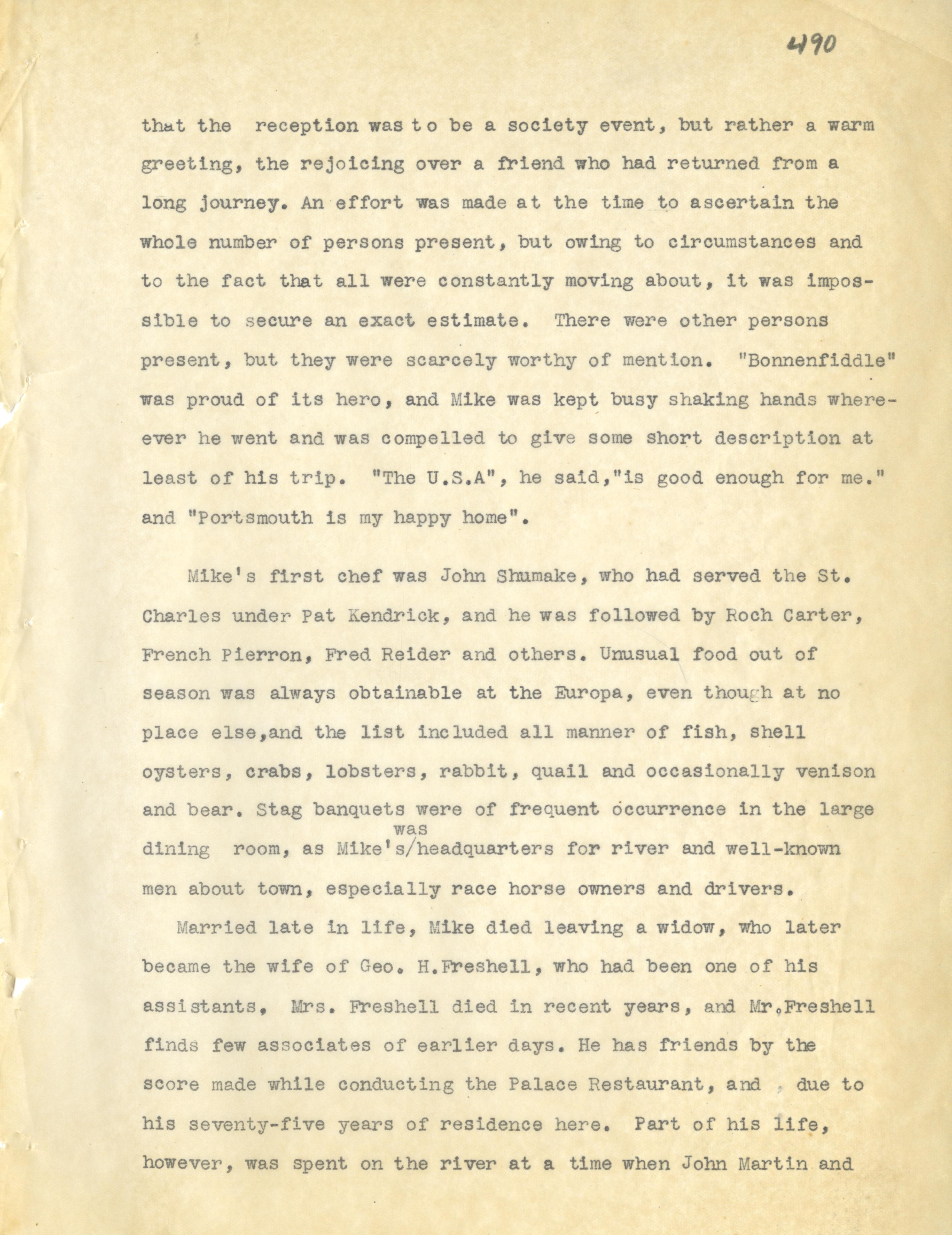 - Photo image of scanned scrapbook page 490. Bonnenfiddle; Mike; John Shumake; Roch Carter; St Charles; Pat Kendrick; French Pierron; Fred Reider; Europa; George H. Freshell; Palace Restaurant; John Martin