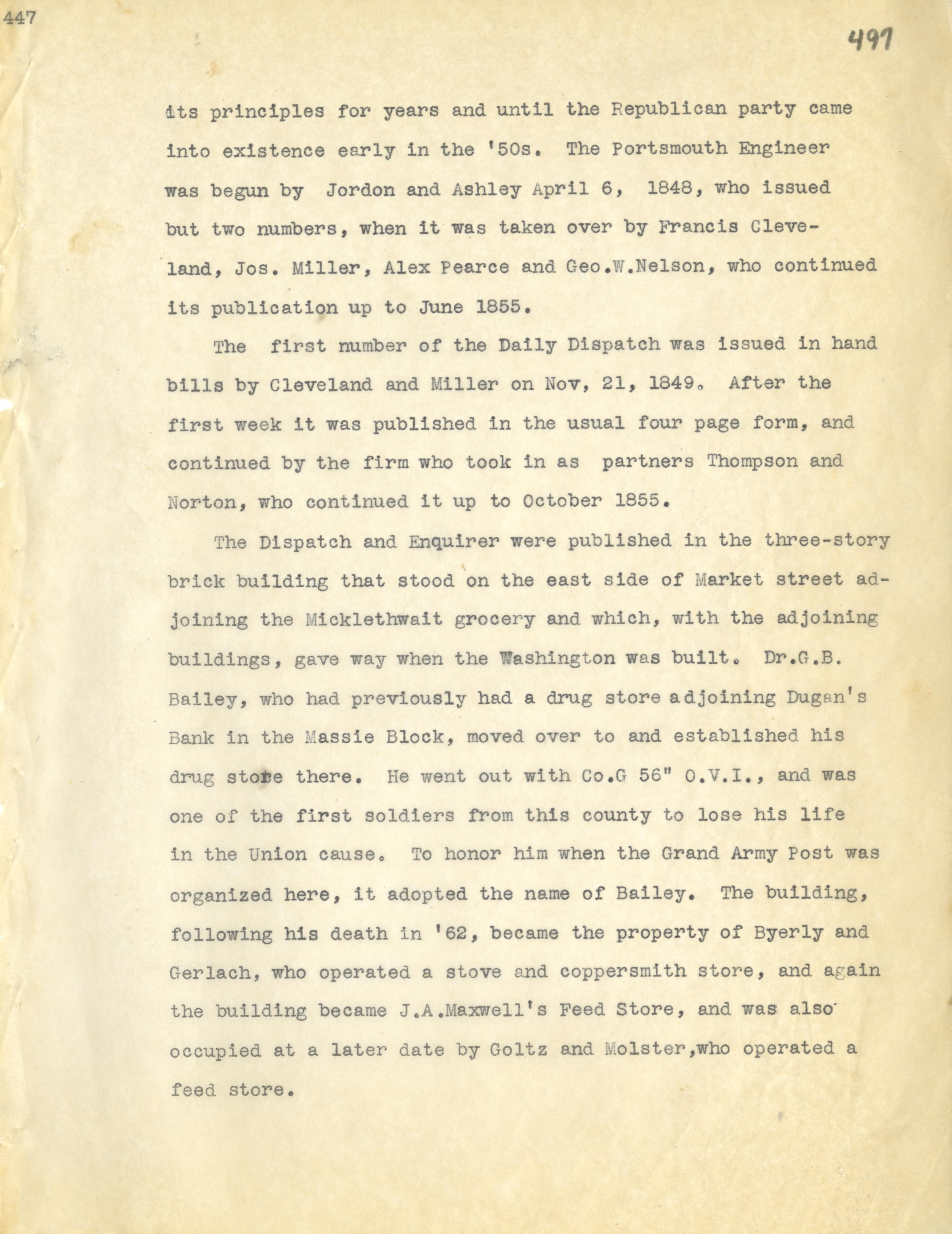- Photo image of scanned scrapbook page 497. Republican Party (1850s); The Portsmouth Engineer; Jordan and Ashley (1848); Francis Cleveland; Joseph Miller; Alex Pearce; George W. Nelson (1855); The Daily Dispatch (1849); Thompson and Norton (1855); The Dispatch and Enquirer; Michlethwait Grocery; Dr. G.B. Bailey; Dugan's Bank; Massie Block; Co. G 56" O.V.I.; Grand Army Post; Byerly; Gerlach; J.A. Maxwell's Feed Store; Goltz; Molster