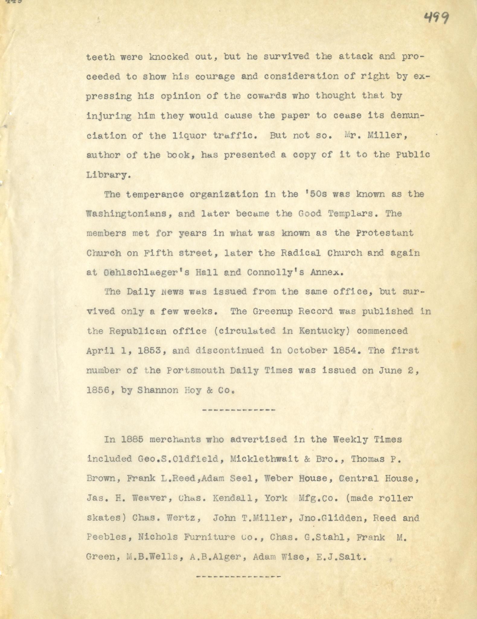 - Photo image of scanned scrapbook page 499. Mr. Miller; Public Library; Temperance Organization (1850s); Washingtonians; Good Templars; Protestant Church; Fifth (5th) Street; Radical Church; Oehlschlaeger's Hall; Connolly's Annex; The Daily News; Greenup Record; Republican Office (1853, 1854); Portsmouth Daily Times (1856); Shannon Hoy & Co; Weekly Times (1885); George S. Oldfield; Michlethwait & Bro; Thomas O. Brown; Frank L. Reed; Adam Seel; Weber House; Central House; James H. Weaver; Charles Kendall; York Mfg Co; Charles Wertz; John T. Miller; John Glidden; Reed and Peebles; Nichols Furniture Co; Charles G. Stahl; Frank M. Green; M.B. Wells; A.B. Alger; Adam Wise; E.J. Salt