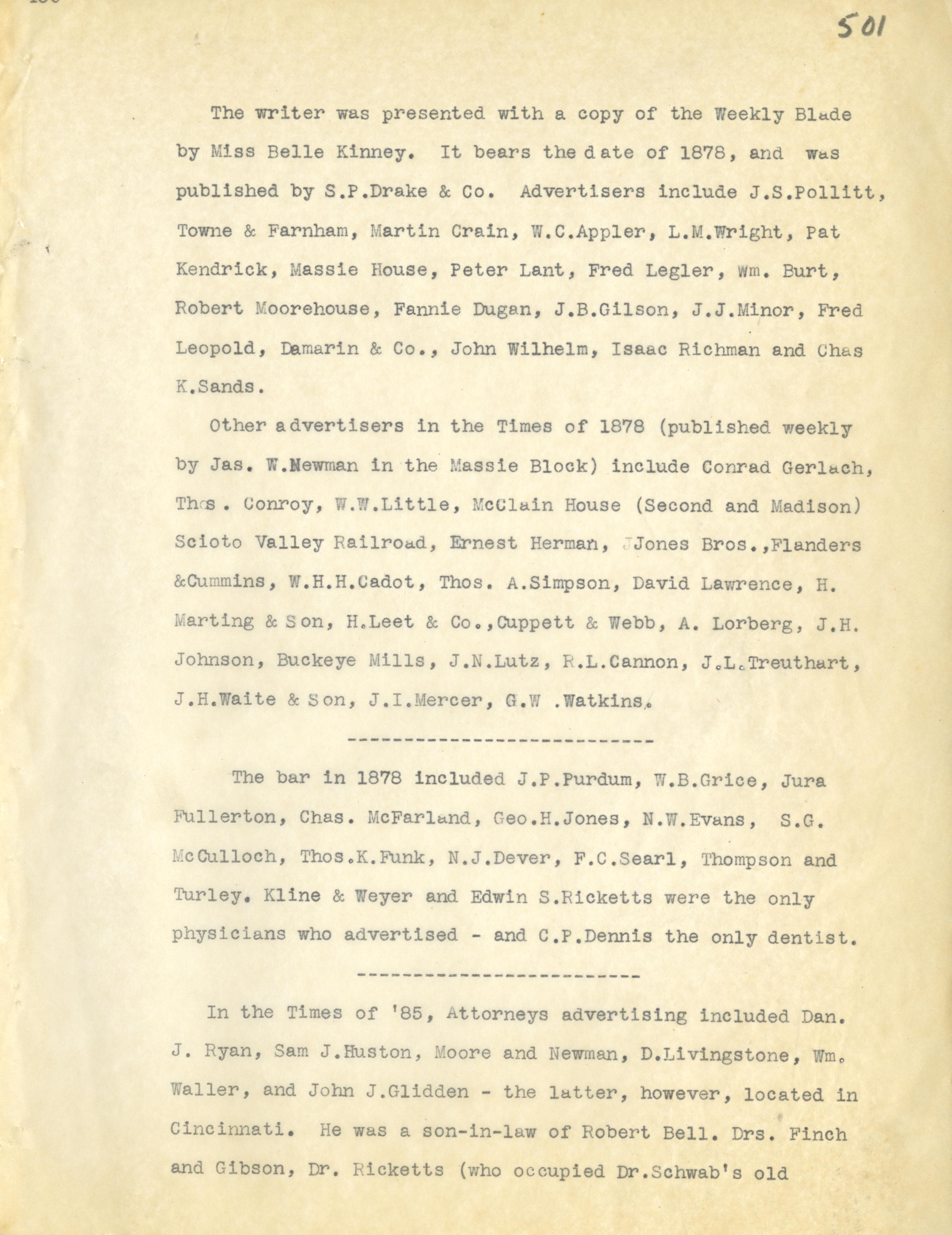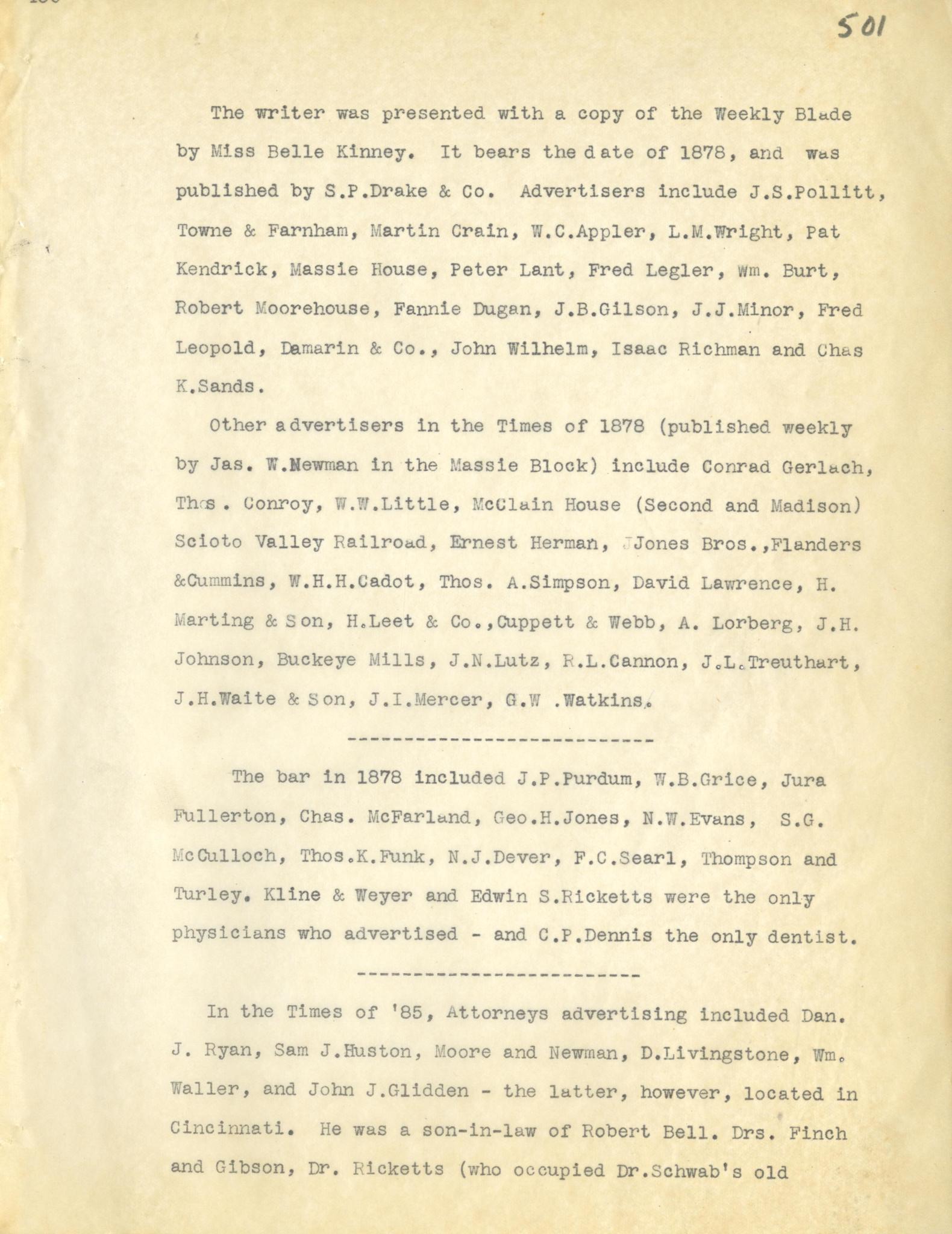 - Photo image of scanned scrapbook page. Pictured: typed page: 1878 Weekly Blade Advertisements for Businesses: Belle Kinney; S. P. Drake & Co.; J. S. Pollitt; Twone & Farnham; Martin Crain; W. C. Appler; L. M. Wright; Pat Kendrick; Massie House; Peter Lant; Fred Legler; Wm. Burt; Robert Moorehouse; Fannie Dugan; J. B. Gilson; J. J. Minor; Fred Leopold; Damarin & Co.; John Wilhelm; Isaac Richman; Chas. K. Sands