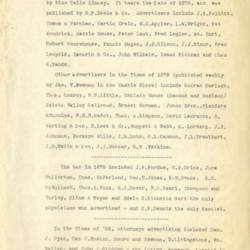 Bar in 1878: W. B. Brice; Jura Fullerton; Chas. McFarland; Geo. H. jones; N. W. Evans; S. G. McCulloch; Thos. K. funk; N. J. Dever; F. C. Searl; Thomson and Turley; Kline & Weyer, Edwin S. Rickletts; C. P. Dennis