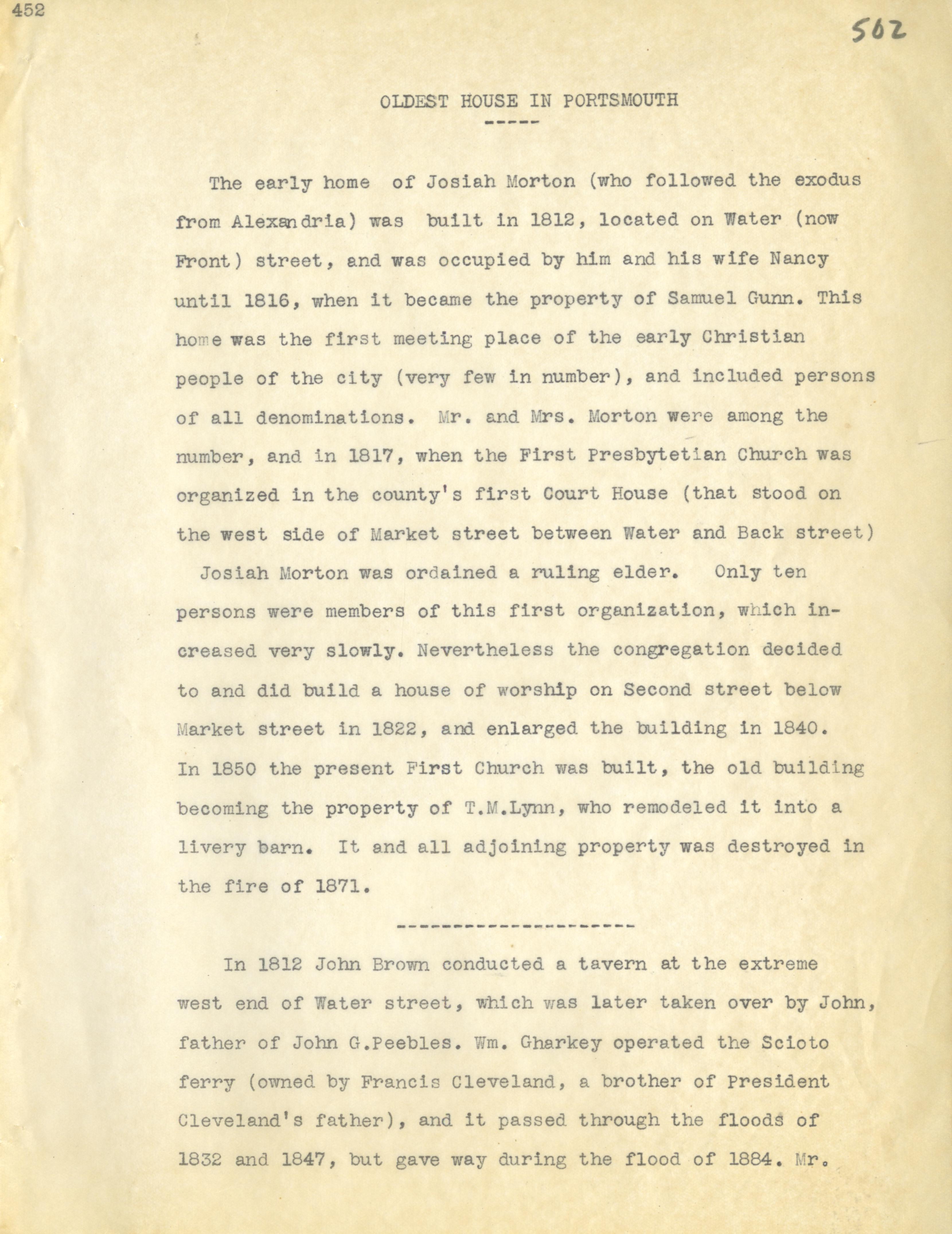 - Photo image of scanned scrapbook page. Pictured: typed page with information about the "Oldest House in Portsmouth" and John Brown's tavern. Josiah Morton's home was built in 1812 on Water (Front) Street; Nancy Morton; Samuel Gunn; first Presbyterian Church; County's first courthouse; ruling elder; First Church; T. M. Lynn; John Peebles; Wm. Gharky; Francis Cleveland; Floods of 1832, 1847, 1884