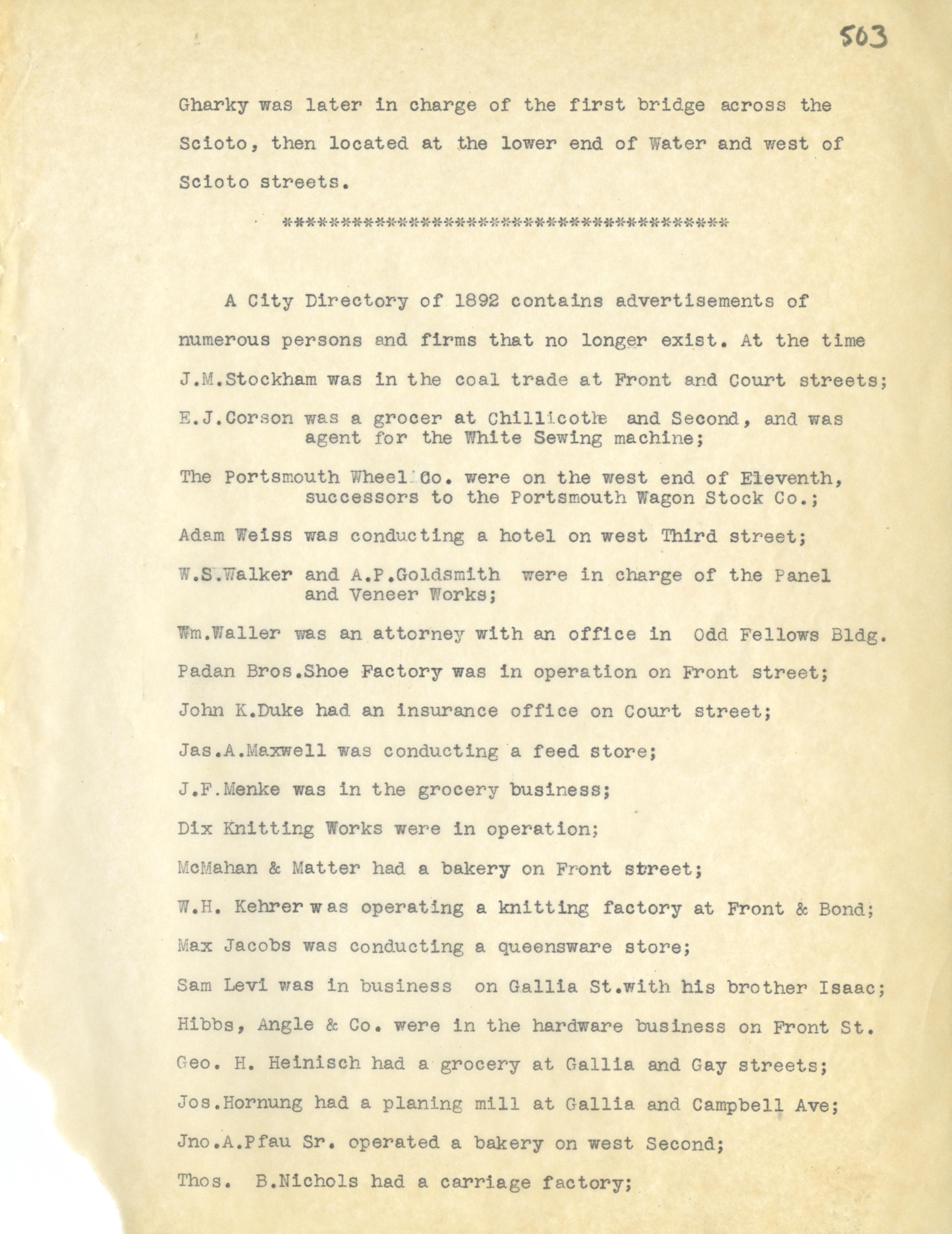 - Photo image of scanned scrapbook page. Pictured: typed page: Gharky in charge of first bridge across the Scioto River; Portsmouth Residents and their Professions From 1892 city directory Advertisement Pages. J. M. Stockham; E. J. Corson, agent for the White Sewing Machine; Portsmouth Wheeling Company; Portsmouth Wagon Stock Company; Adam Weiss, hotel on Third (3rd) Street; W. S. Walker and A. P. Goldsmith were in charge of the Panel and Veneer Works; William Waller; Odd Fellows Building; Padan Bros. Shoe Factory; John K. Duke; James A. Maxwell; J. F. Menke; Dix Knitting Works; McMaham & Matter; W. H. Kehrer; Max Jacobs; Sam Levi and brother Isaac Levi; Hibbs, Angle & Company on Front Street; George H. Heinisch; Joseph Hornung; John A. Pfau Sr.; Thomas B. Nichols