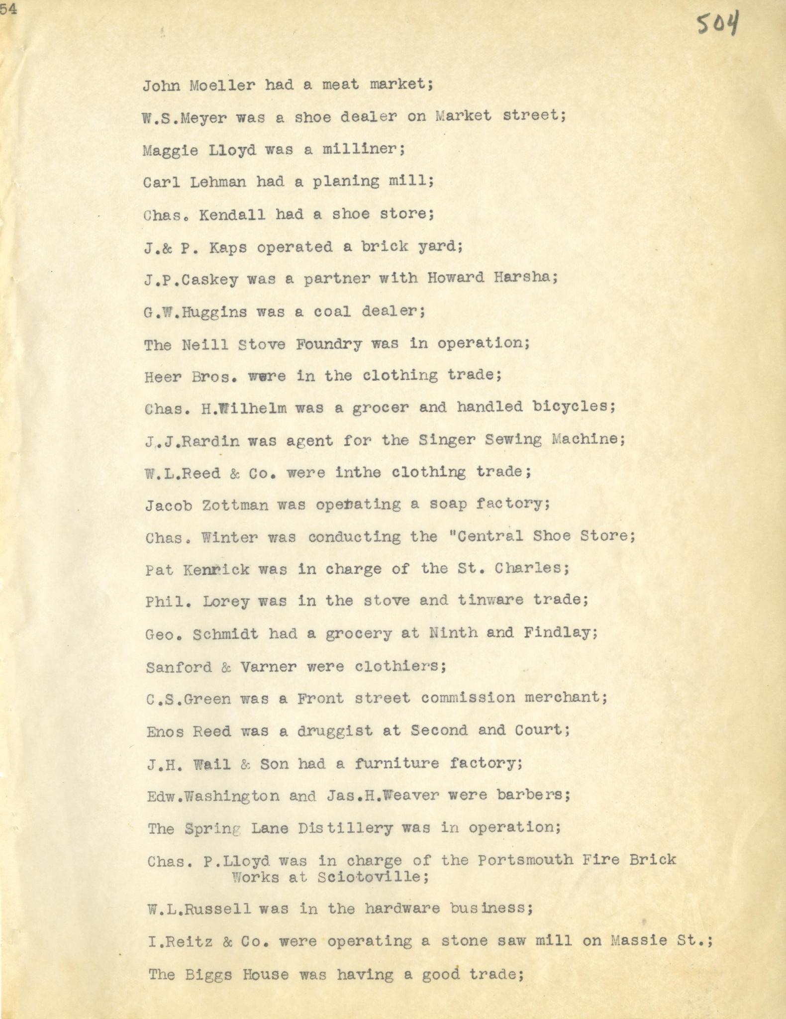 - Photo image of scanned scrapbook page. Pictured: typed page: Portsmouth Residents and their Professions From 1892 city directory Advertisement Pages. John Moeller; W. S. Meyer; Maggie Lloyd; Carl Lehman; Charles Kendall; J & P Kaps; J. P. Caskey; G. W. Huggins; The Neill Stove Foundry; Heer Bros.; Charles H. Wilhelm; J. J. Rardin; W. L. Reed & Co.; Jacob Zottman; Charles Winter was conducting the Central Shoe Store; Pat Kenrick; Phil. Lorey; George Schmidt; Sanford & Varner; C. S. Green; Enos Reed; J. H. Wail & Son; Edward Washington; James H. Weaver; Spring Lane Distillery; Charles P. Lloyd, in charge of the Portsmouth Fire Brick Company works at Sciotoville; W. L. Russell; I. Reitz & Company were operating an stone saw mill on Massie Street; Biggs House