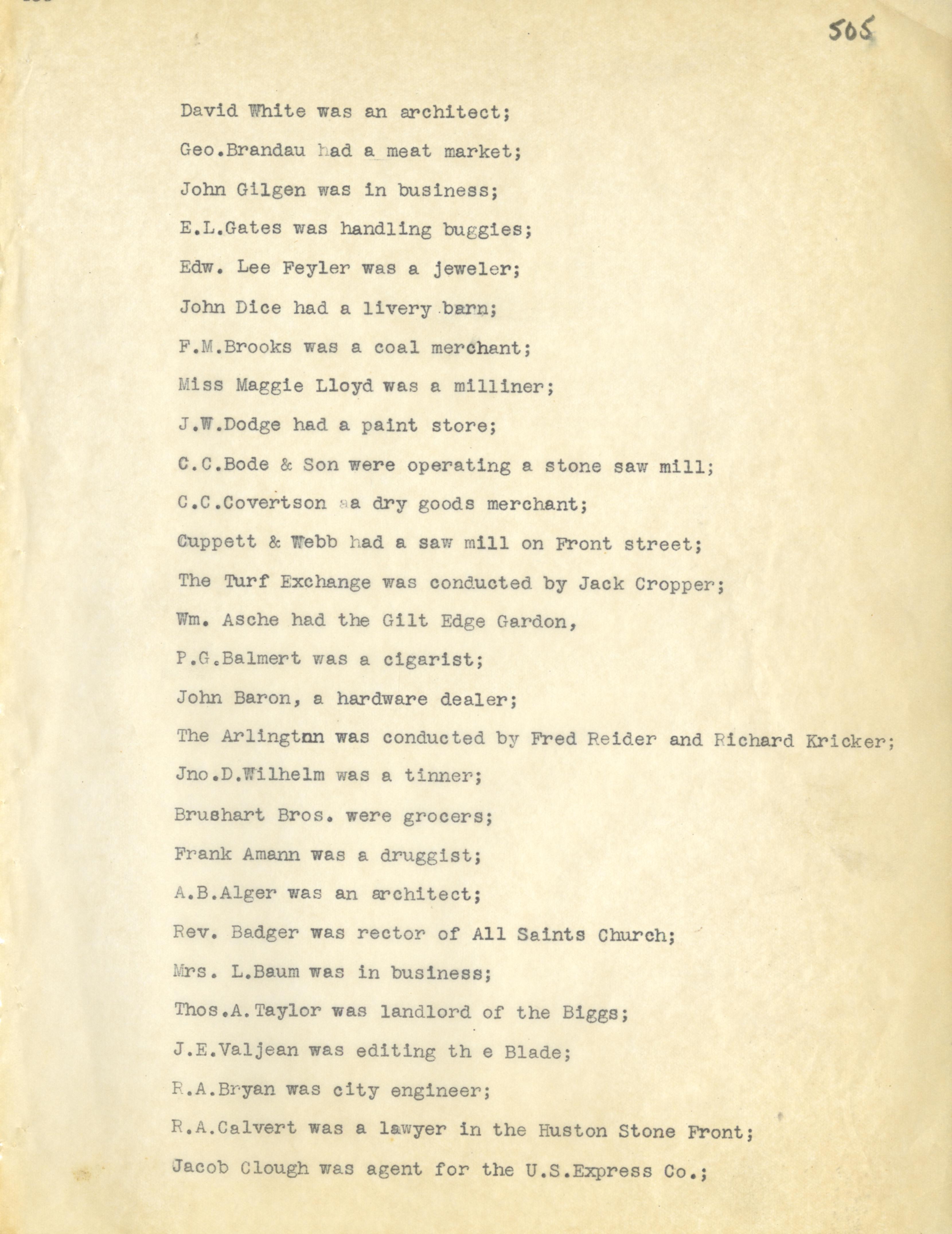 - Photo image of scanned scrapbook page. Pictured: typed page: Portsmouth Residents and their Professions From 1892 city directory Advertisement Pages; David White; Geo. Brandau; John Gilgen; E. L. Gates; Edw. Lee Feyer; John Dice; F. M. Brooks; Maggie Lloyd; J. W. Dodge; C. c. bode; C. C. Covertson; Cuppett & Webb; The Turf Exchange, conducted by Jack Cropper; Wm. Asche had the Gilt Edge Garden; P. G. Balmert; John Baron; The Arlington conducted by Fred Reider and Richard Kricker; John D. Wilhelm; Brushart Brothers; Frank Amann; A. B. Alger; Rev. Badger; Mrs. L. Baum; Thos. a. Taylor; J. E. Valjean; R. A. Bryan; R. A. Calvert was a lawyer in the Huston Stone Front; Jacob Clough