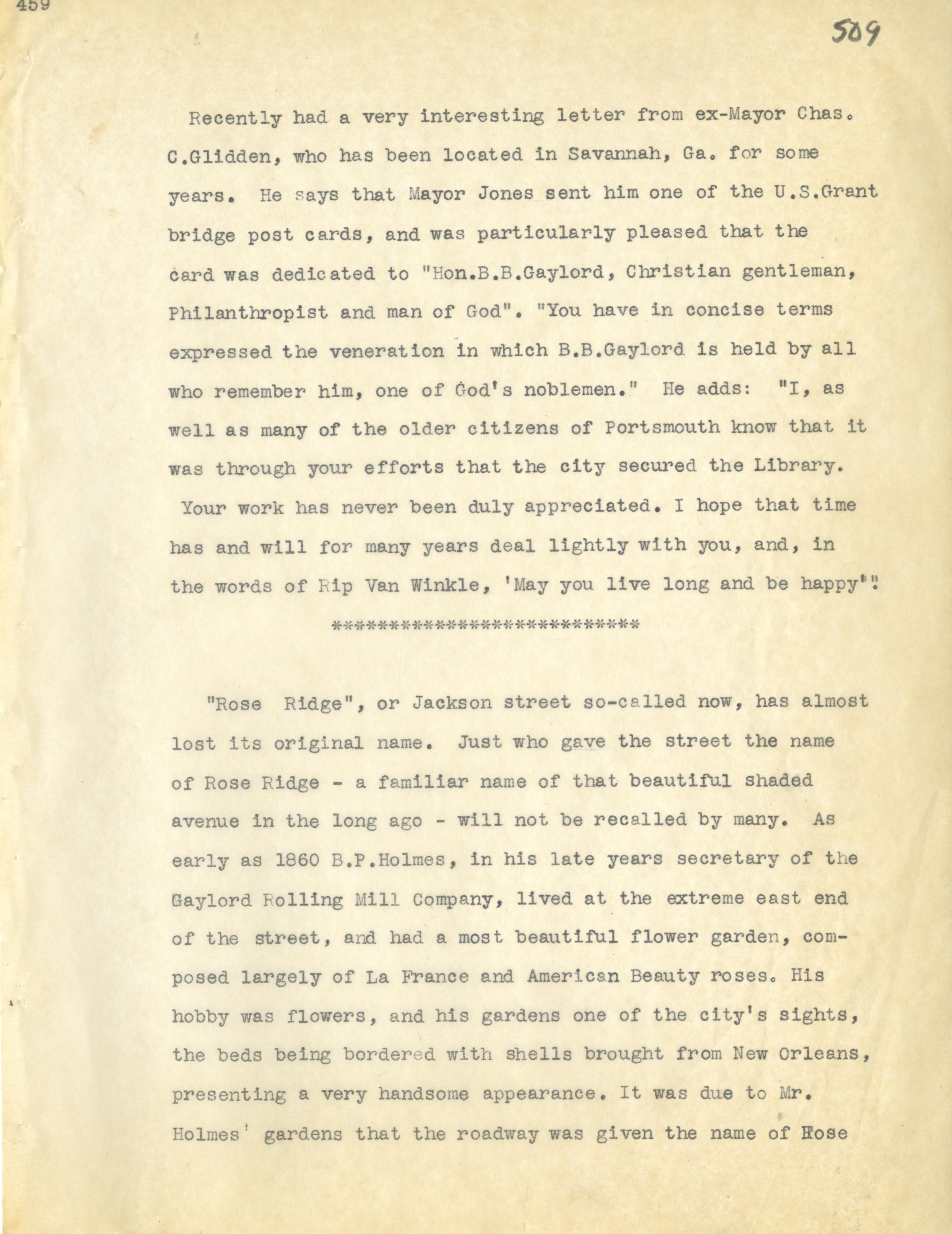 - Photo image of scanned scrapbook page. Pictured: typed page: Writing on U. S. Grant Postcard; Ex-Mayor Chas. C. Glidden; Mayor Jones; B. B. Gaylord; library; Rose Ridge or Jackson Street; B. P. Holmes; flower garden; Mr. Holmes' gardens