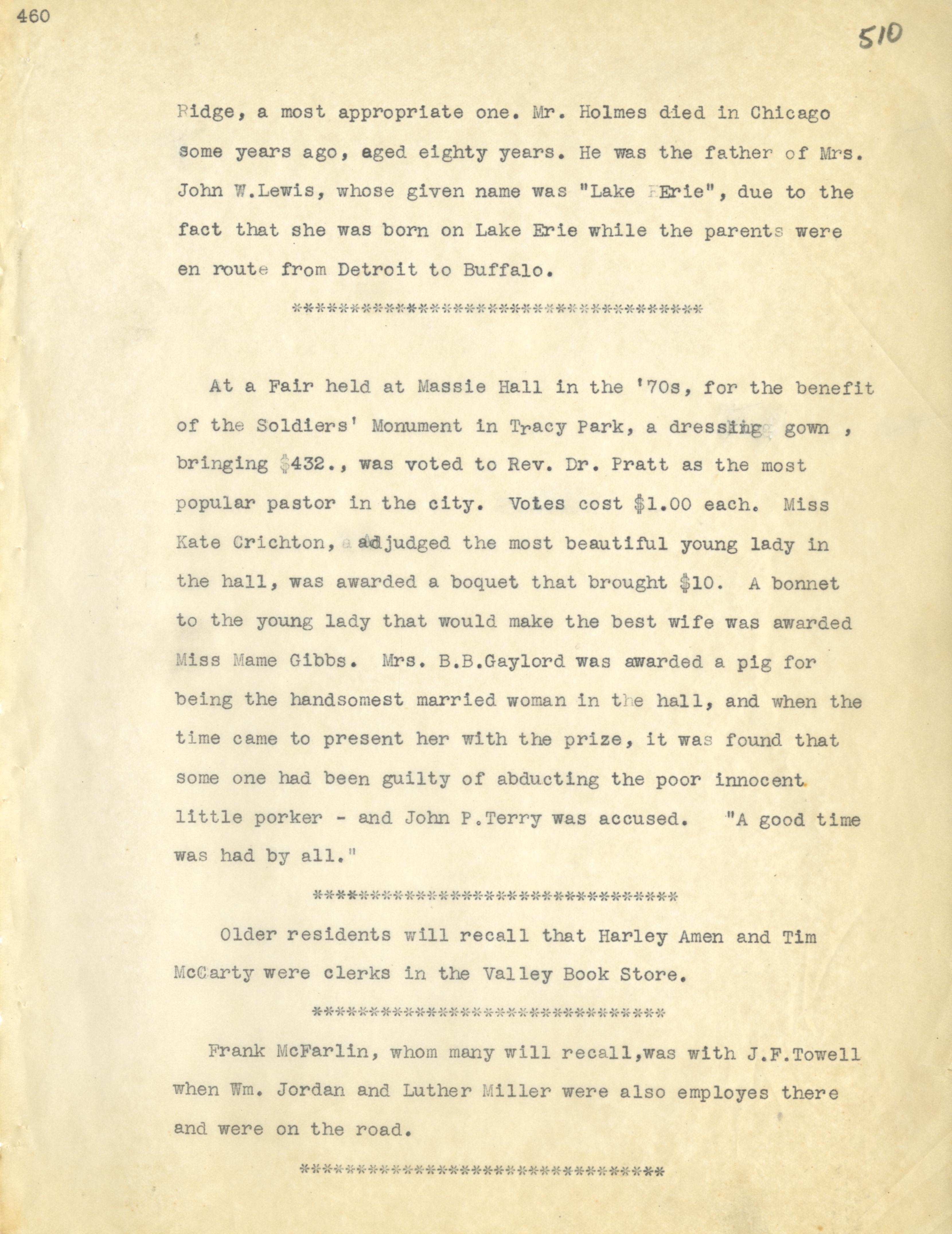 - Photo image of scanned scrapbook page. Pictured: typed page with information about local merchants and businessmen and some entertainment; Mr. Holmes; John W. Lewis; Lake Erie; Fair at Massie Hall; Soldiers' Monument; Rev. Dr. Pratt; Kate Crichton; Mame Gibbs; G. G. Gaylord; Harley Amen; Tim McCarty; Valley Book Store; Frank McFarlin; J. F. Towell; William Jordan; Luther Miller