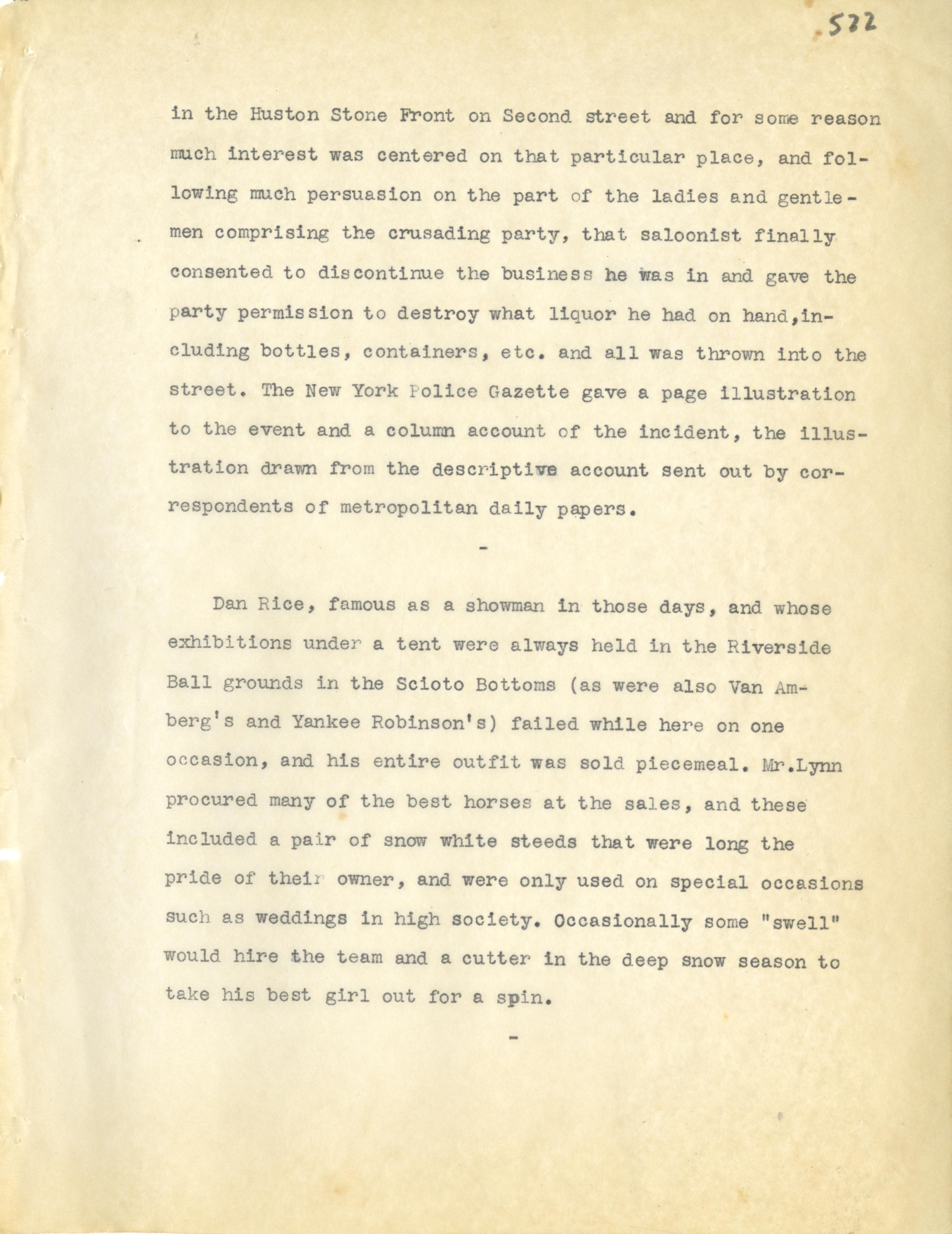 - Photo image of scanned scrapbook page. Pictured: typed page about the Crusade of the W. C. T. U. continued; Dan Rice's Horse Stables; Riverside Ball Grounds; Scioto Bottoms; Mr. Lynn