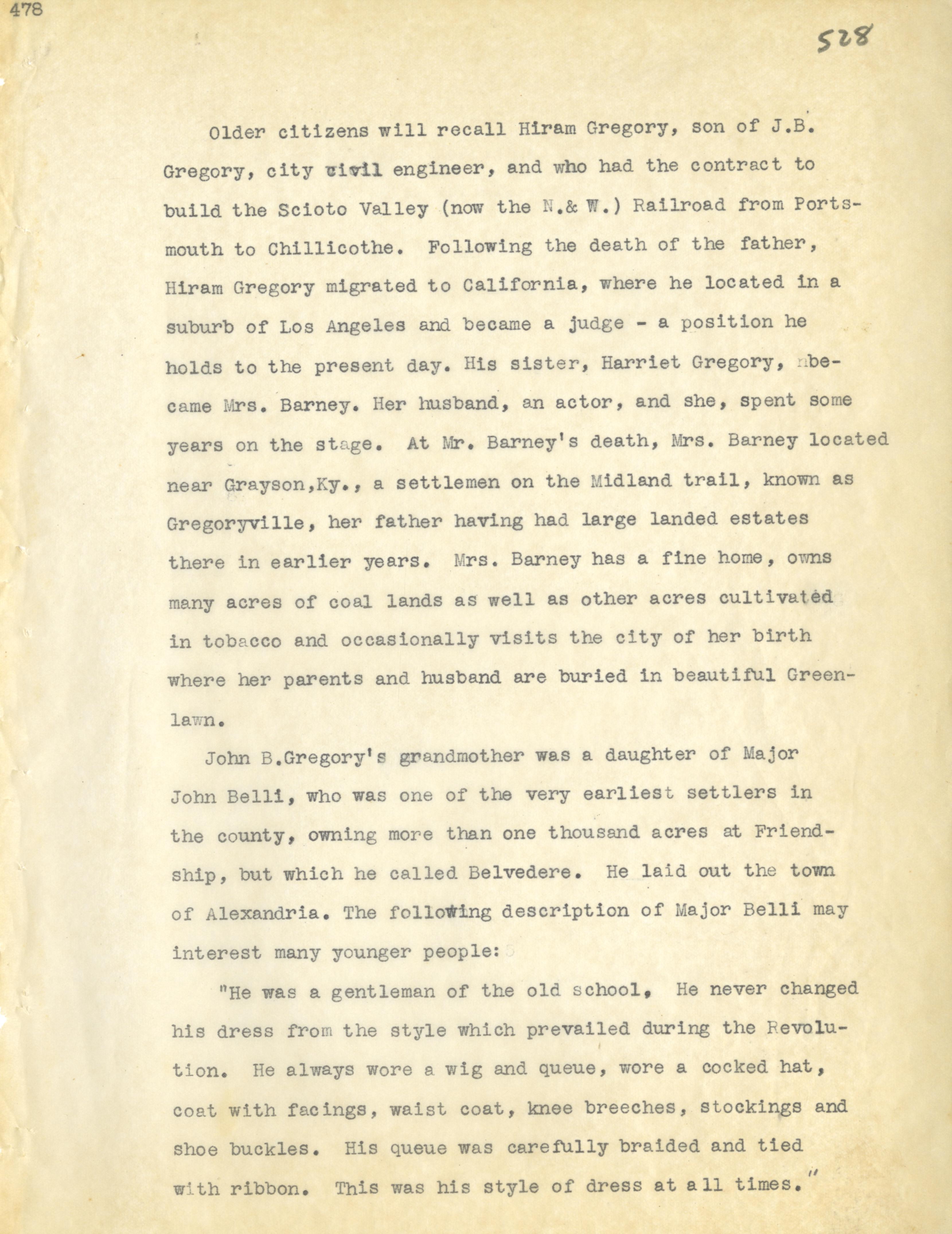 - Photo image of scanned scrapbook page 528. Hiram Gregory; J.B. Gregory; City Civil Engineer; Scioto Valley (N. & W.) Railroad; Harriet Gregory; Mrs. Barney; Midland Trail; Greenlawn; John B. Gregory; Major John Belli; Friendship; Belvedere; Alexandria; Revolution