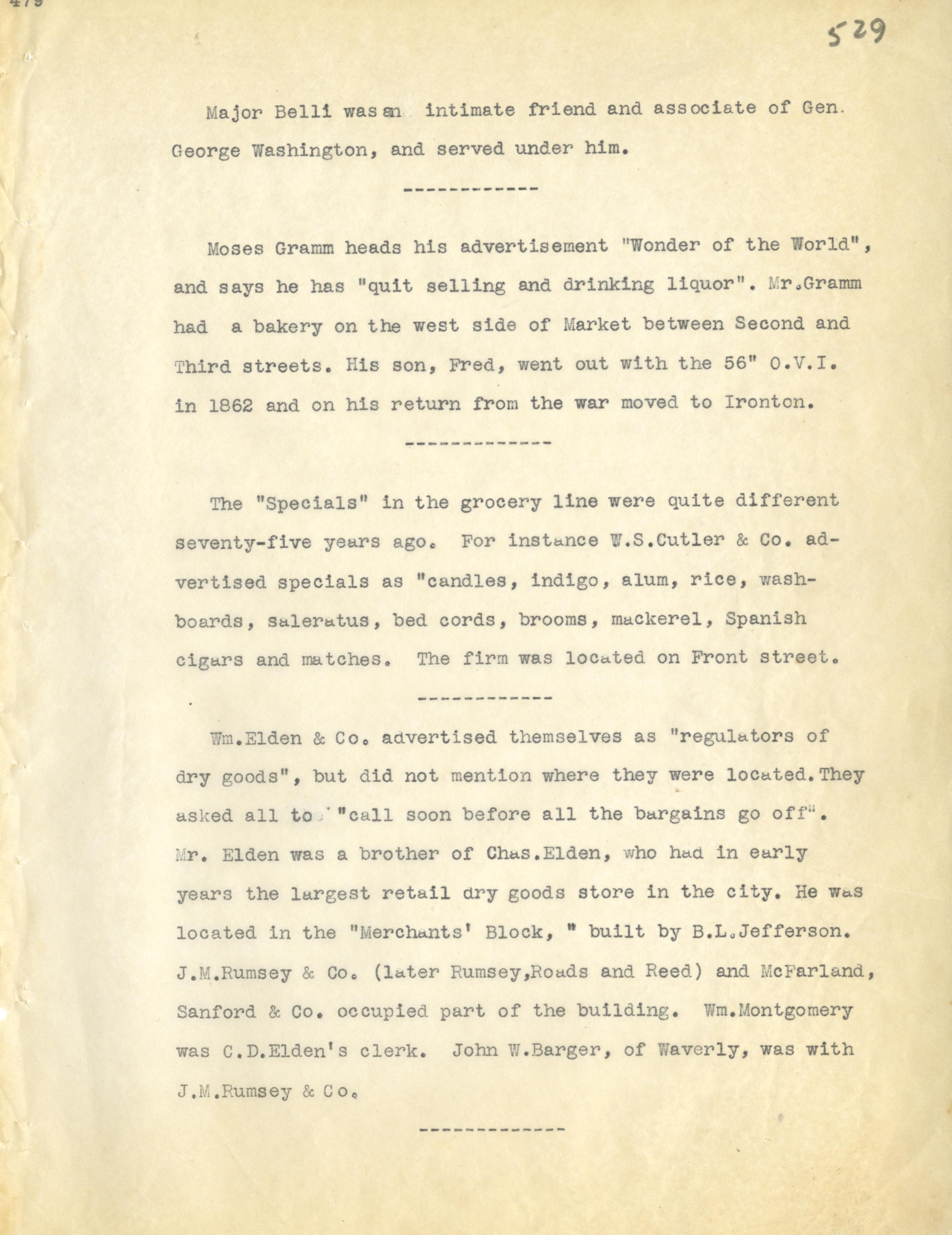 - Photo image of scanned scrapbook page. Pictured: typed page about local Portsmouth businessmen. Major Bell; Moses Gramm's bakery; Fred Gramm; William Elden & Company; Merchants' Block; B. L. Jefferson; J. M. Rumsey & Company; McFarland, Sanford & Company; William Montgomery; C. D. Elden; John W. Barger of Waverly; J. M. Rumsey & Company