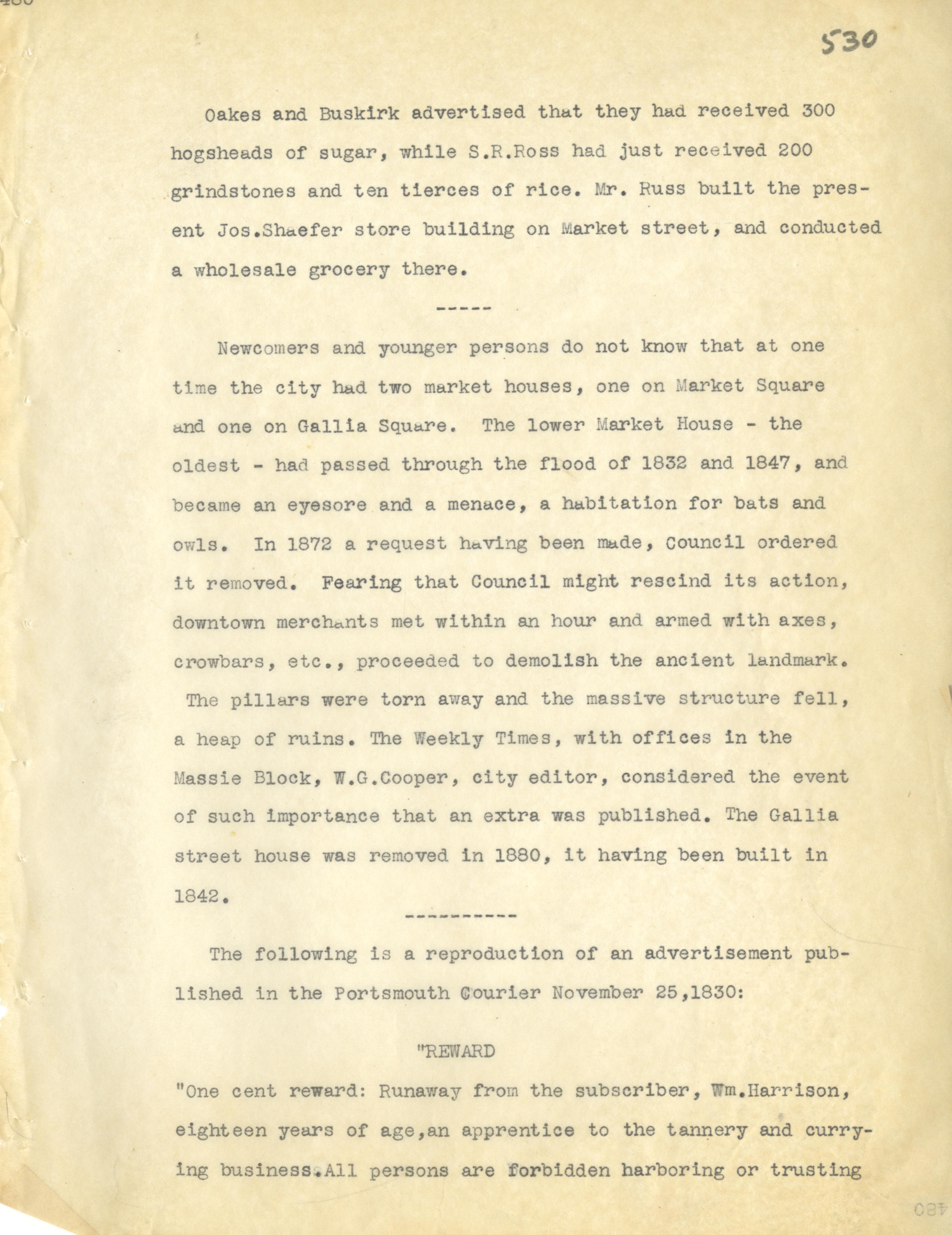 - Photo image of scanned scrapbook page. Pictured: typed page with information about early Portsmouth businesses. Oakes and Buskirk; S. R. Ross; Market Square; Weekly Times; Massie Block; W. G. Cooper; Gallia Street house; William Harrison