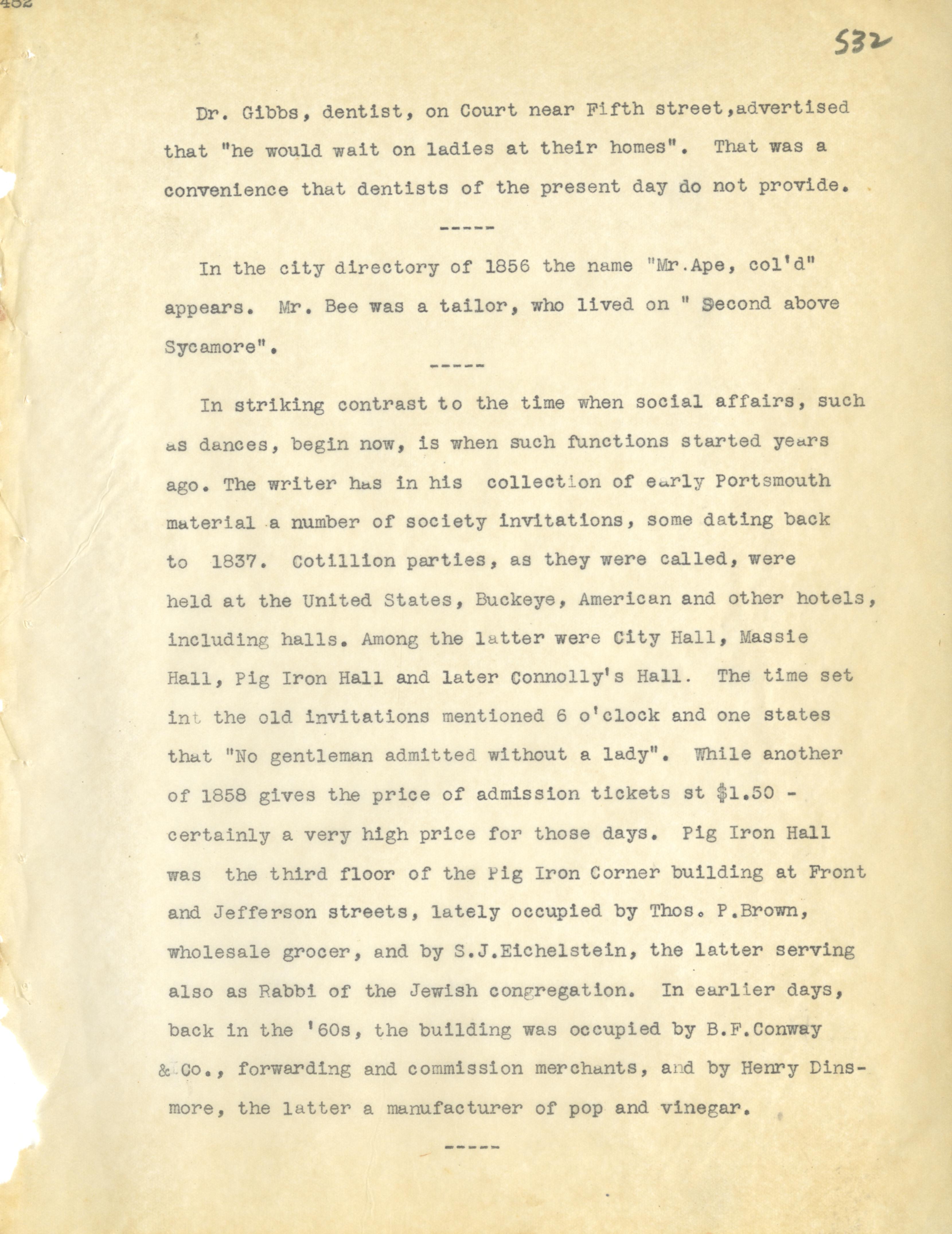- Photo image of scanned scrapbook page. Pictured: typed page with information about Dr. Gibbs; Mr. Bee, Tailor; Social Affairs; Cotillion Parties; early Portsmouth; United States Hotel; Buckeye Hotel; American Hotel; City Hall; Massie Hall; Pig Irton Hall; Connolly's Hall; Thomas P. Brown; S. J. Eichenlstein; B. F. Conway & Company