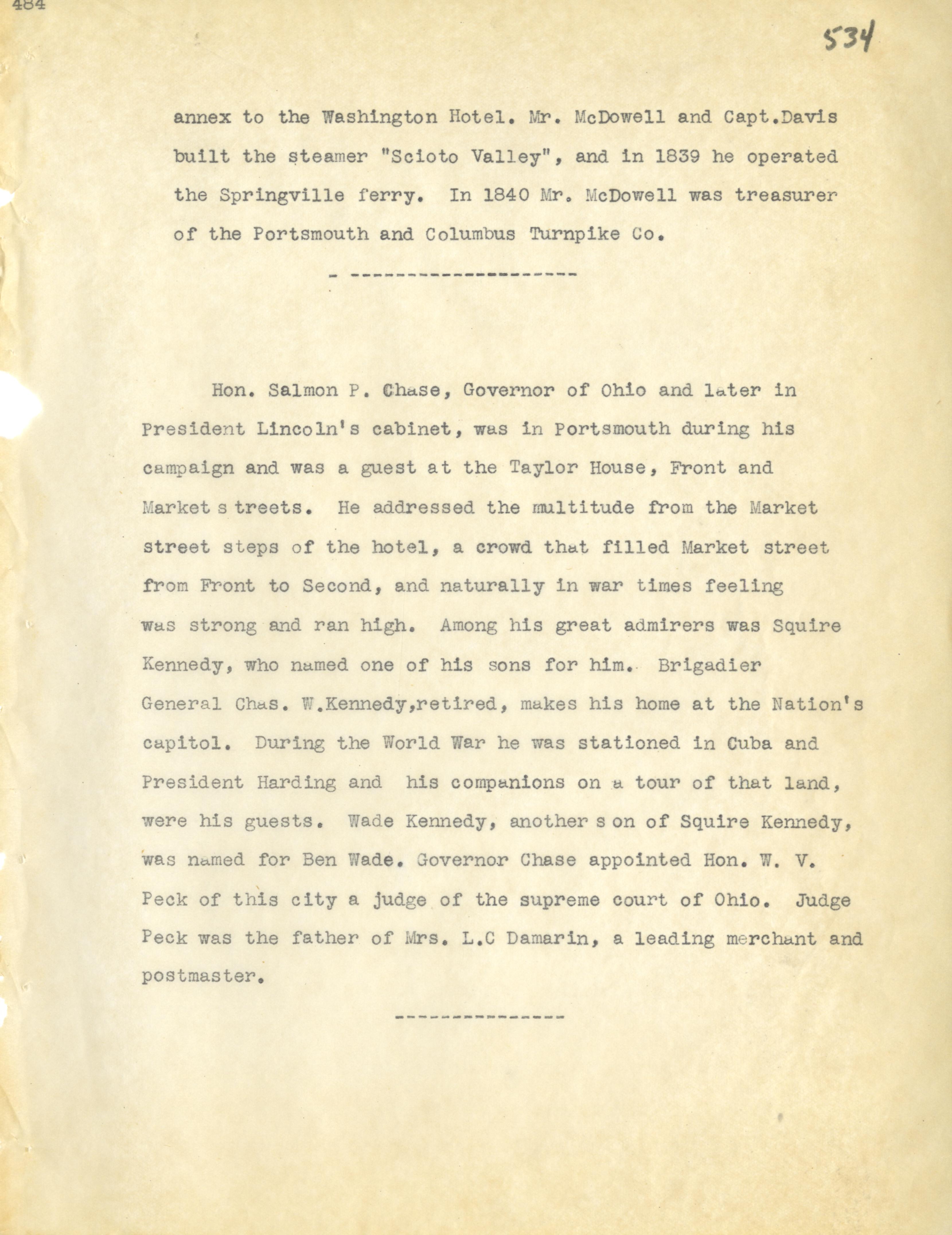 - Continuation of the Washington Hotel; Steamer Scioto Valley; Hon. Salmon P. Chase, Governor of Ohio's stay in Portsmouth; Mr. McDowell; Captain Davis; Springville Ferry; Taylor House; Squire Kennedy; Ben Wade; Hon. W. V. Peck; Mrs. Damarin