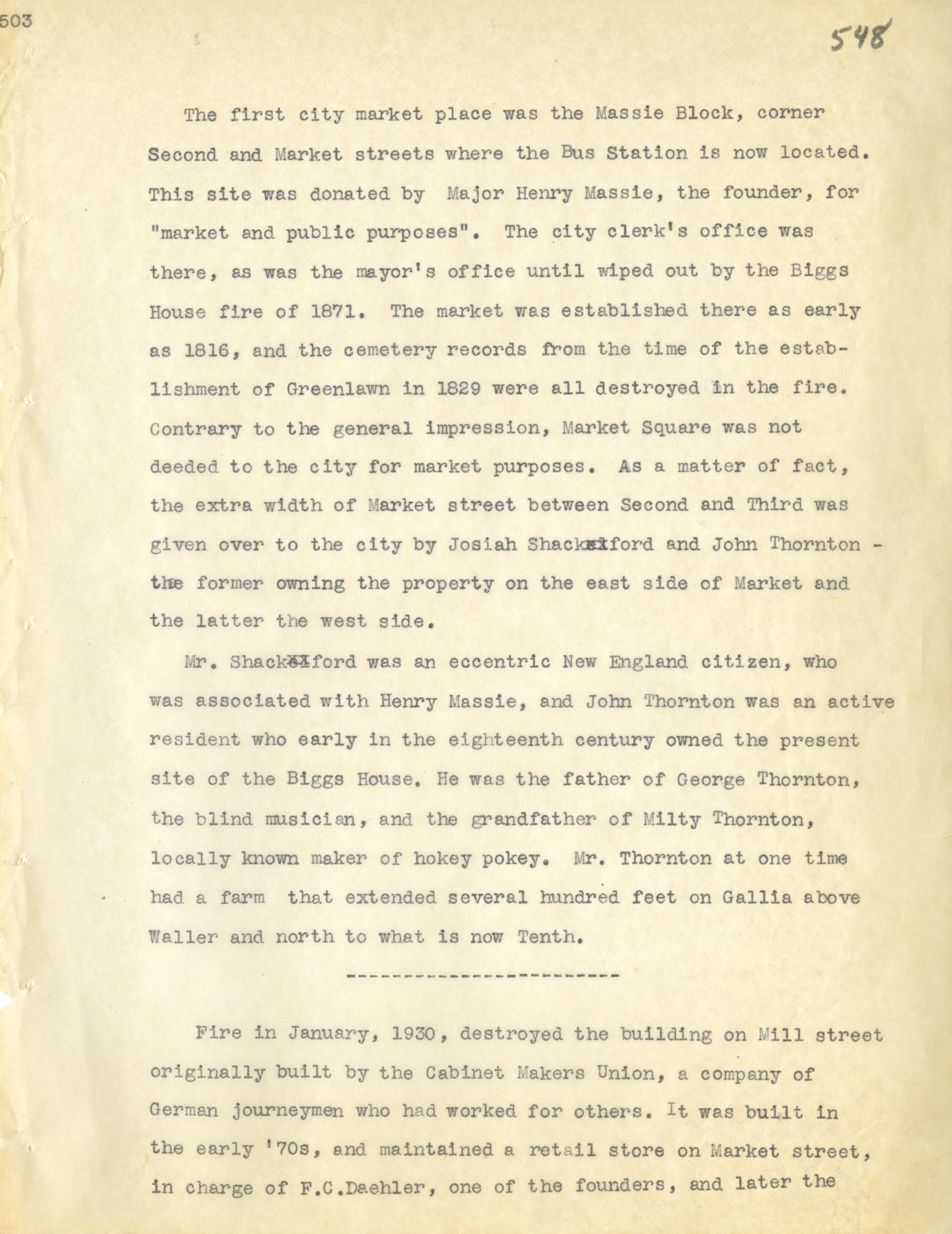 - Photo image of scanned scrapbook page. Pictured is a typed page: Fire Destroys Building on Mill street;Cabinet Makers Union; German Journeymen; F. C. Daehler; First City Market Place; Massie block; Bus station; Major Henry Massie; city clerk's office; Greenlawn; Market Square; Josiah Shackelford; John Thornton; George Thornton; Milty Thornton