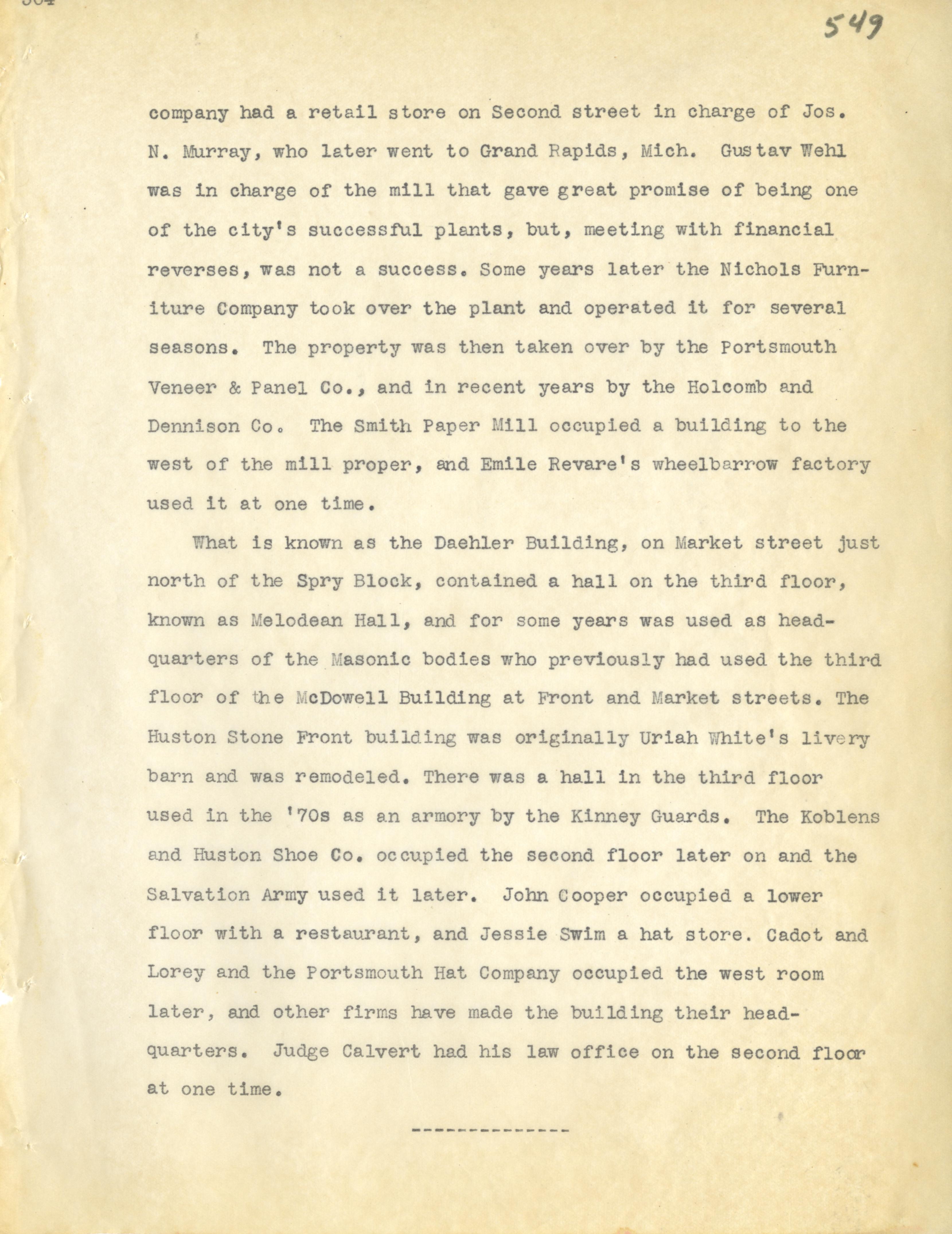 - Photo image of scanned scrapbook page. Pictured: typed page with information about the Fire Destroys Building on Mill Street; retail company on Second Street; Jos. N. Murray; Gustav Tav Wehl; Nicholas Furniture Company; Portsmouth Veneer & Panel Company; Holcomb and Dennison Company; Smith Paper Mill; Emile Revare's wheelbarrow factory; Daehler Building on Market Street; Melodean Hall; McDowell Building; Uriah White' Livery Barn; Kinney Guards; Koblens and Huston Shoe Company; John Cooper; Jessie Swmi Hat Store; Cadot and Lorey and the Portsmouth Hat Company; Judge Calvert