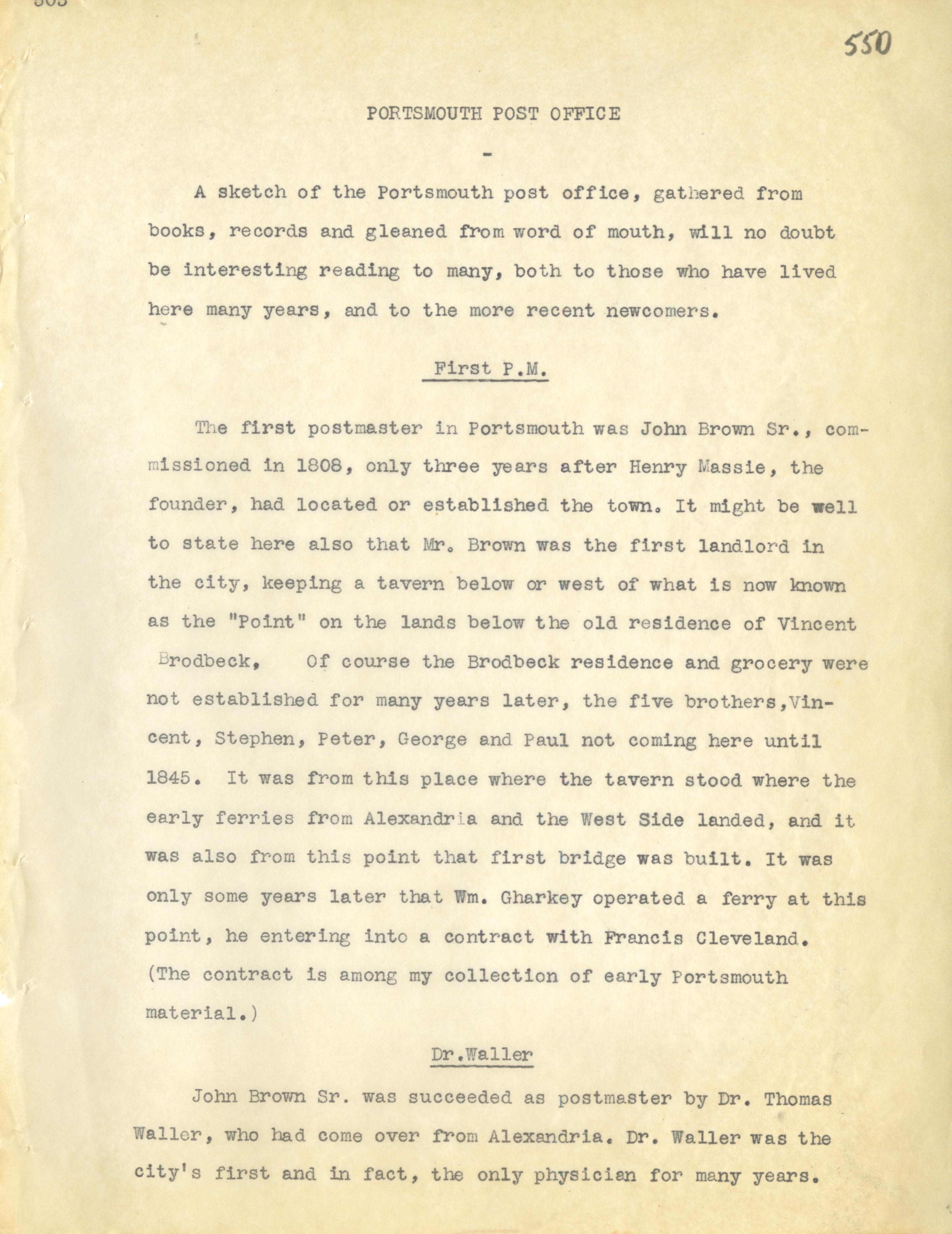 - Photo image of scanned scrapbook page. Pictured: typed page about Portsmouth Post Office; First Postmaster: John Brown Sr.; Henry Massie; Vincent Brodbeck; Stephen Brodbeck; Peter Brodbeck; George Brodbeck; Paul Brodbeck; William Gharkey; Francis Cleveland; Dr. Waller; Alexandria