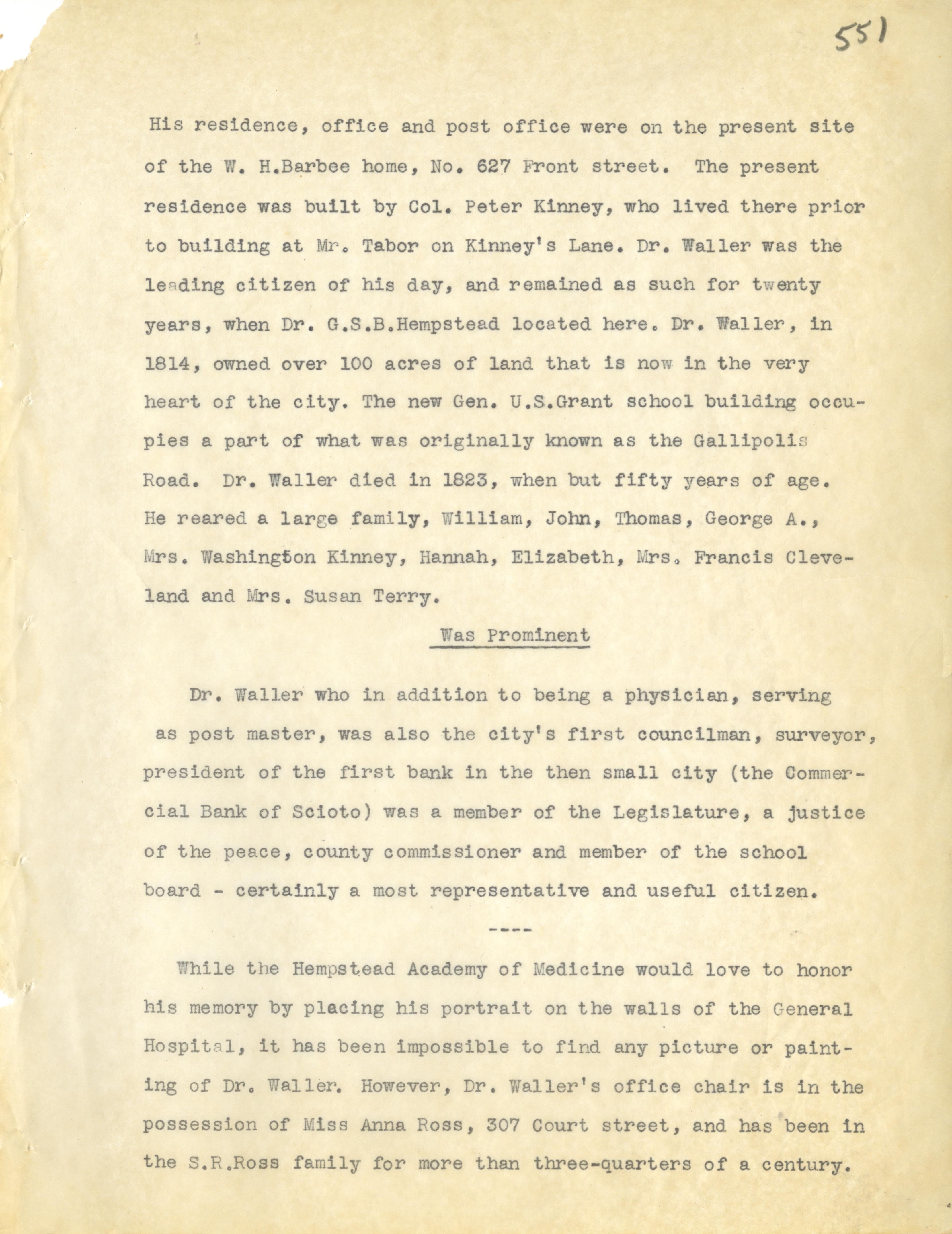 - Photo image of scanned scrapbook page. Pictured: typed page with information about Postmasters and Post Offices; Doctors and Hospitals; W. H. Barbee; Col. Peter Kinney; Mt. Tabor; Kinney's Lane; Gen. U. S. Grant Bridge; Dr. Waller; William Kinney; John Kinney; Thomas Kinney; George A. Kinney; Mr. Washington Kinney; Hannah Kinney; Elizabeth Kinney; Mrs. Francis Cleveland; Susan Terry; Commercial Bank of Scioto County; Hempstead Academy of Medicine; Anna Ross; S. R. Ross