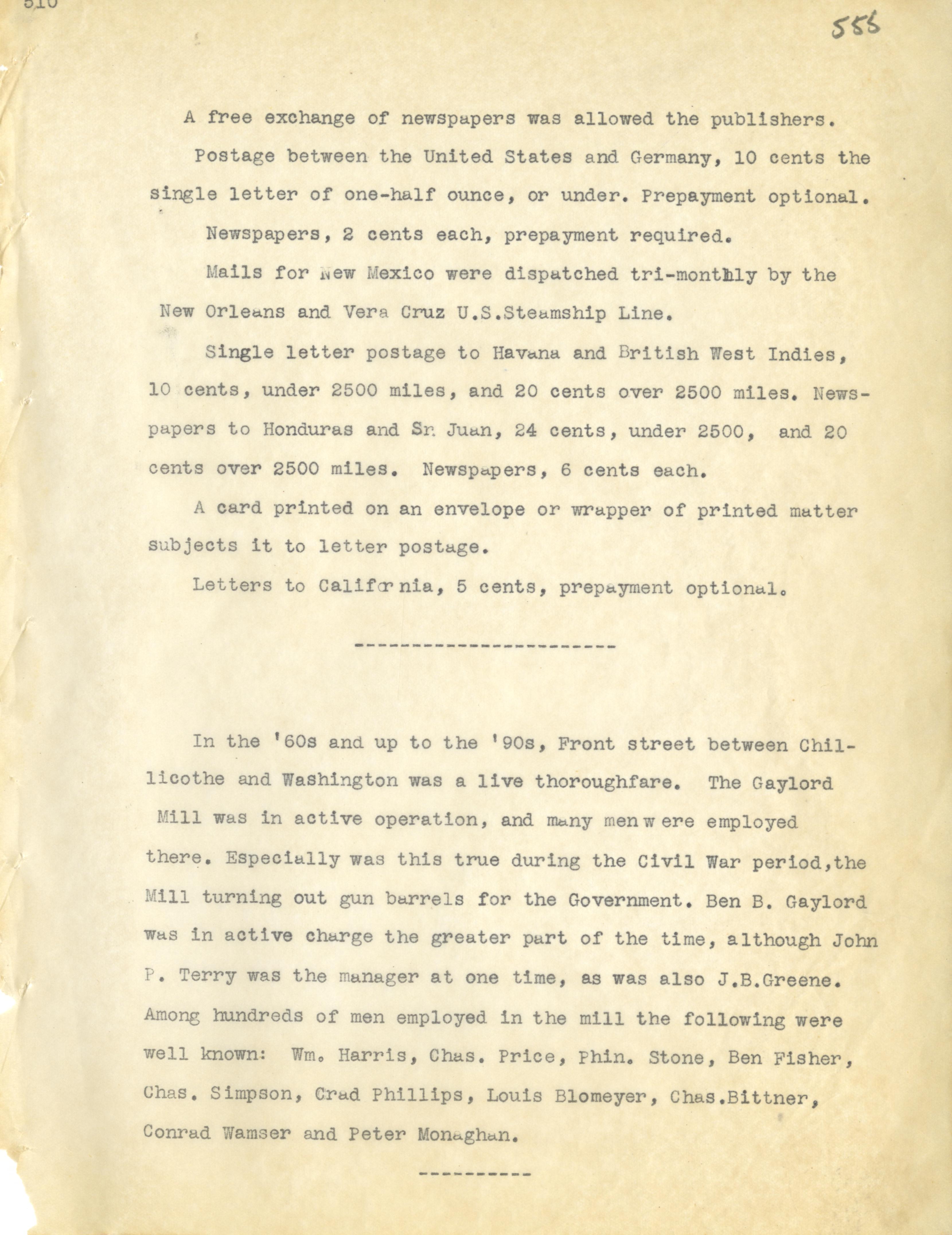 - Photo image of scanned scrapbook page. Pictured: typed page with information about Newspapers; Gaylord Mill; newspaper postage; Ben B. Gaylord; John P. Terry; William Harris; Charles Price; Phin Stone; Ben Fisher; Charles Simpson; Crad Phillips; Louis Blomeyer; Chas. Bittner; Conrad Wamser; Peter Monaghan
