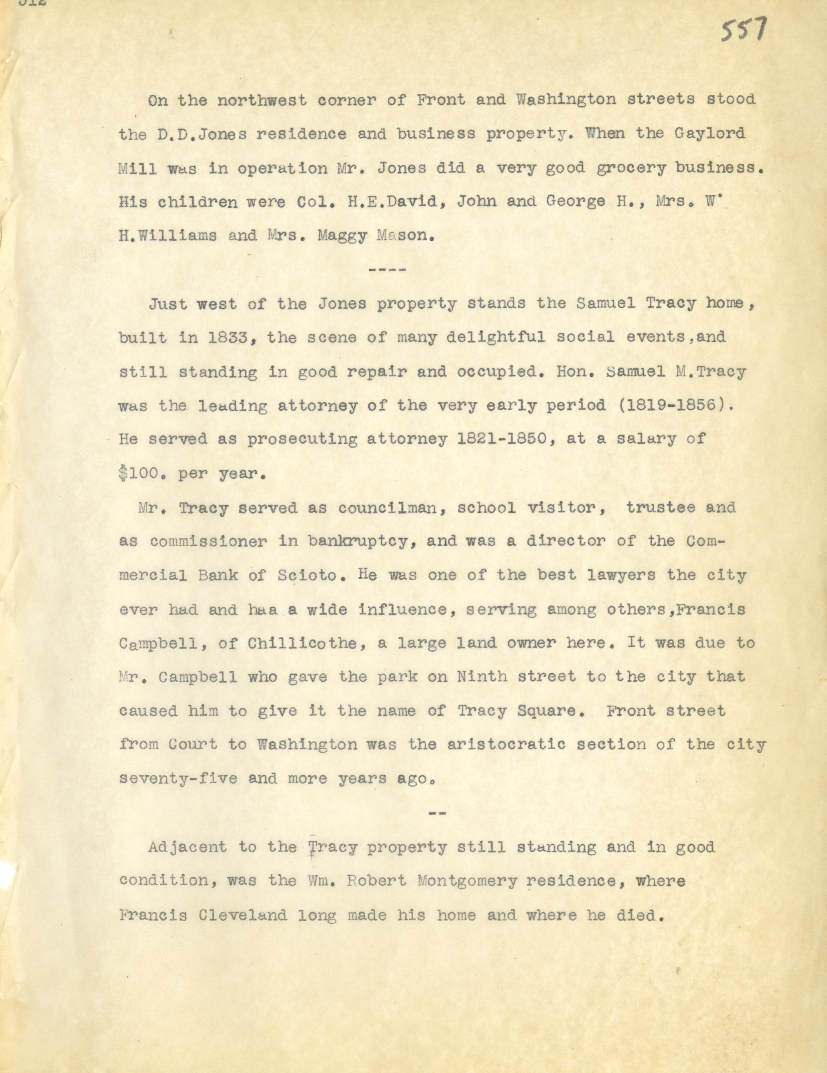 - Photo image of scanned scrapbook page. Pictured: typed page with information about local citizens and their residences and professions. D. D. Jones home at the corner of Front and Washington Streets; Gaylord Mill; Col. H. E. David; John and George H.; Mrs. W. H. Williams; Maggy Mason; Samuel Tracy Home; Hon. Samuel Tracy, leading attorney from 1819 to 1856; Francis Campbell; Robert Montgomery residence; Francis Cleveland