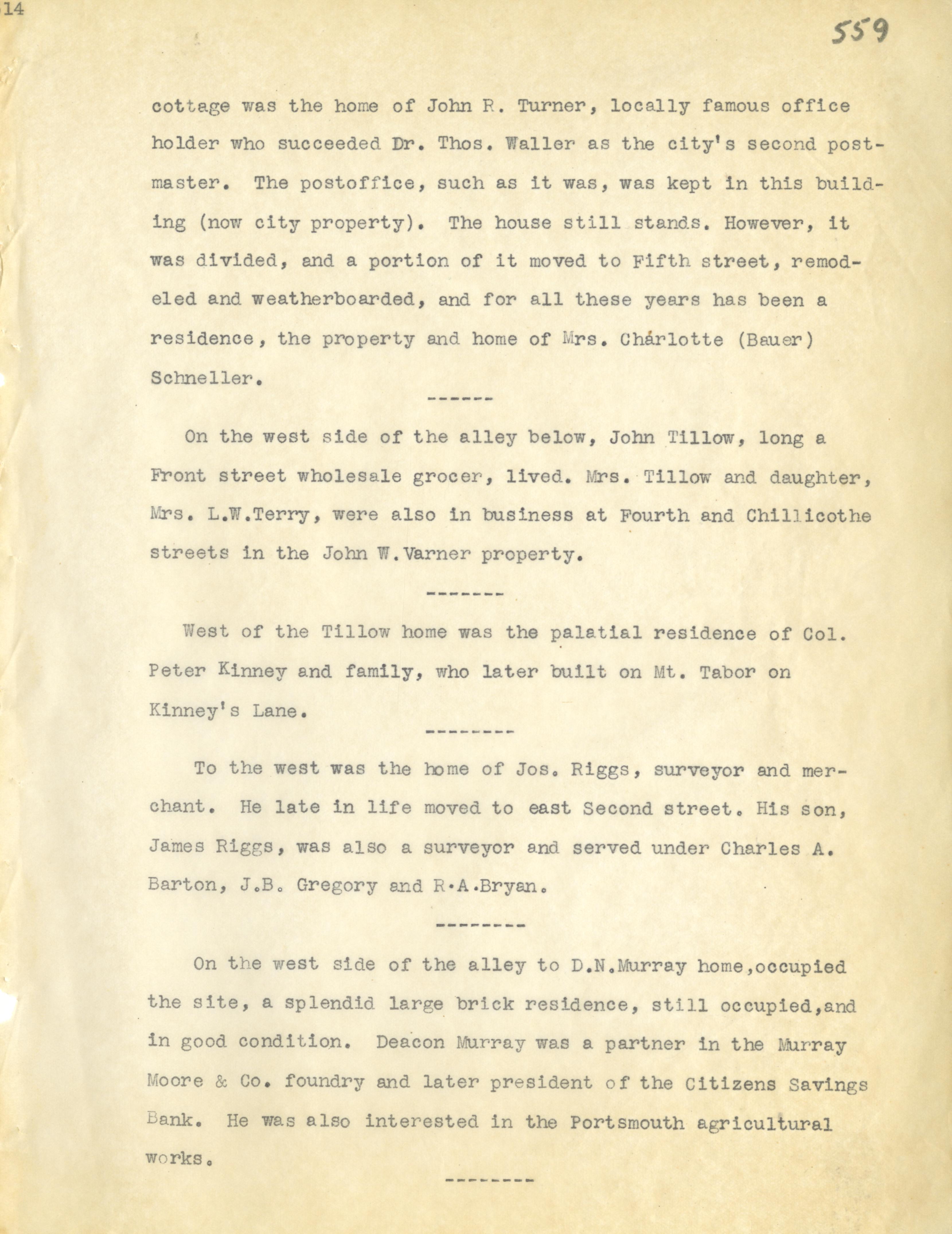 - Photo image of scanned scrapbook page. Pictured: typed page with information about local citizens' residences and professions; John R. Turner; Dr. Thomas Waller; post office; Mrs. Charlotte (Bauer) Schneller; John Tillow; Mrs. Tillow; Mrs. L. W. Terry; John W. Varner; Col. Peter Kinney; Joseph Riggs; James Riggs; Charles A. Barton; J. B. Gregory; R. A. Bryan; D. N. Murray; Deacon Murray; Citizens Savings Bank; Portsmouth Agricultural Works
